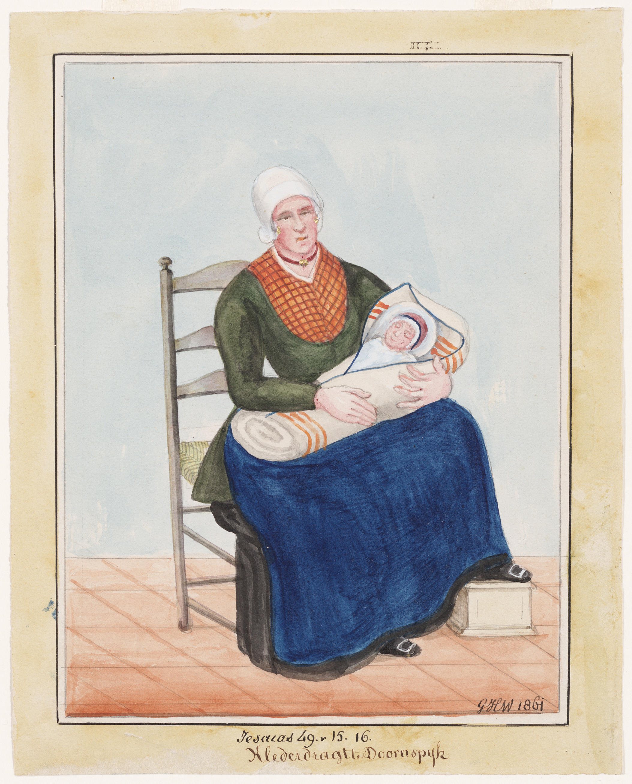 Aquarel van een vrouw in de negentiende-eeuwse dracht van Doornspijk met een ingebakerde baby op haar schoot. Bij pasgeboren kinderen werden de eerste weken van hun leven de beentjes stijf ingepakt in verschillende lagen doeken. De buitenste laag vormt een dekentje dat in verschillende plaatsen als doopdekentje in gebruik is geweest. De Bijbeltekst waarnaar in ...