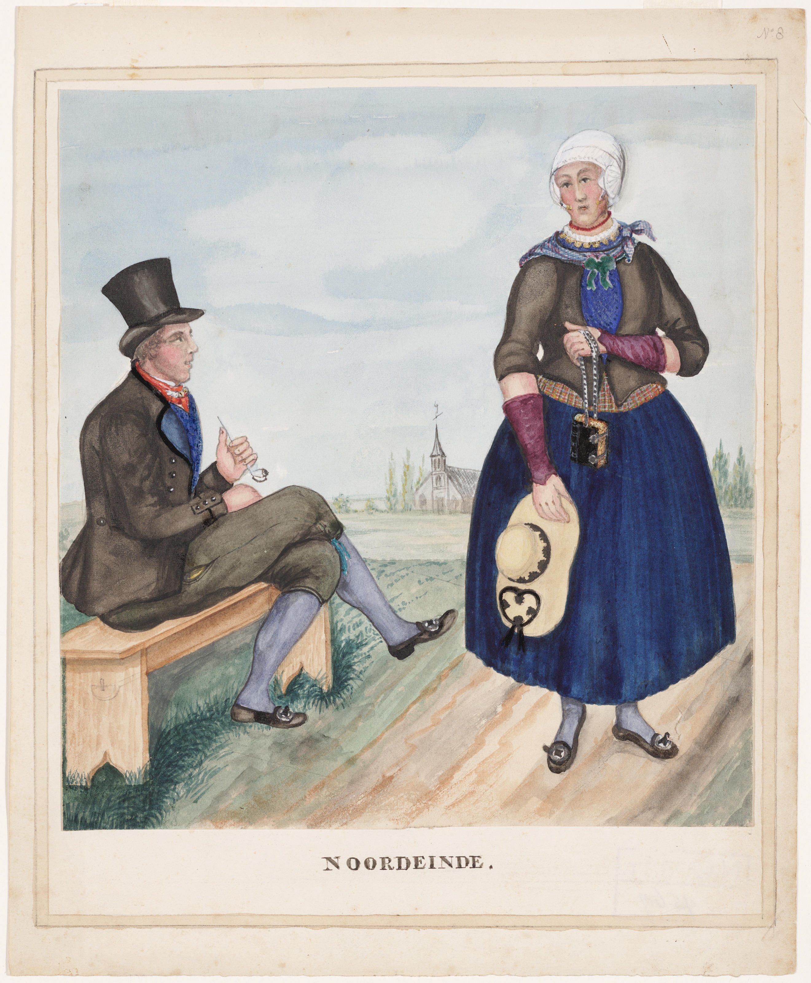 Aquarel van een man en vrouw in de zondagse dracht van Noordeinde omstreeks het midden van de negentiende eeuw. Noordeinde ligt tussen Kampen en Elburg en is de meest noordelijke plaats in Gelderland. De vrouw heeft mitaines, mouwloze handschoenen, aan en houdt haar strohoed en een kerkboek met zilverbeslag in haar handen.