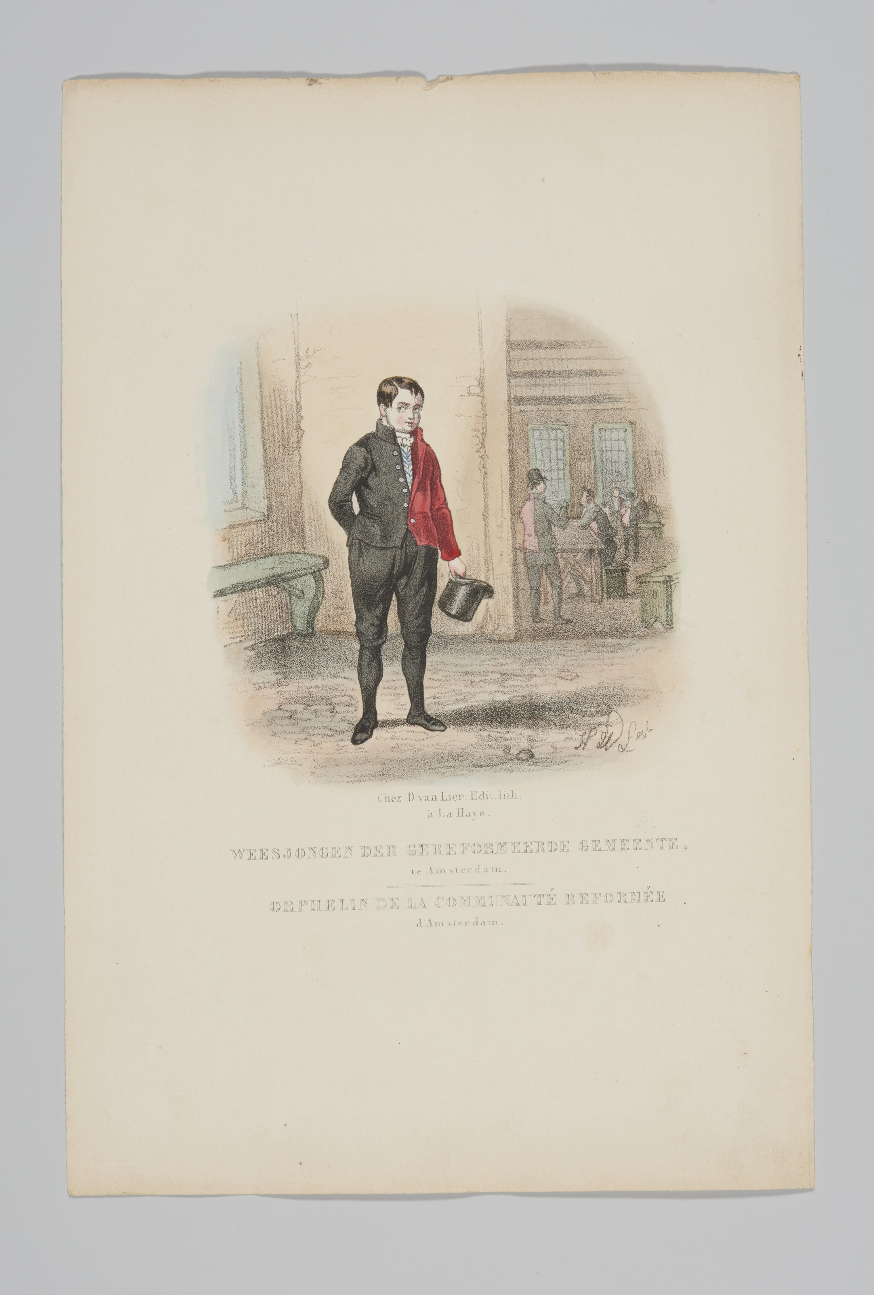 Prent van een gereformeerde weesjongen uit Amsterdam. De jongen is gekleed in een zwarte kuitbroek, zwarte kousen, en een half zwart/half rood jasje.