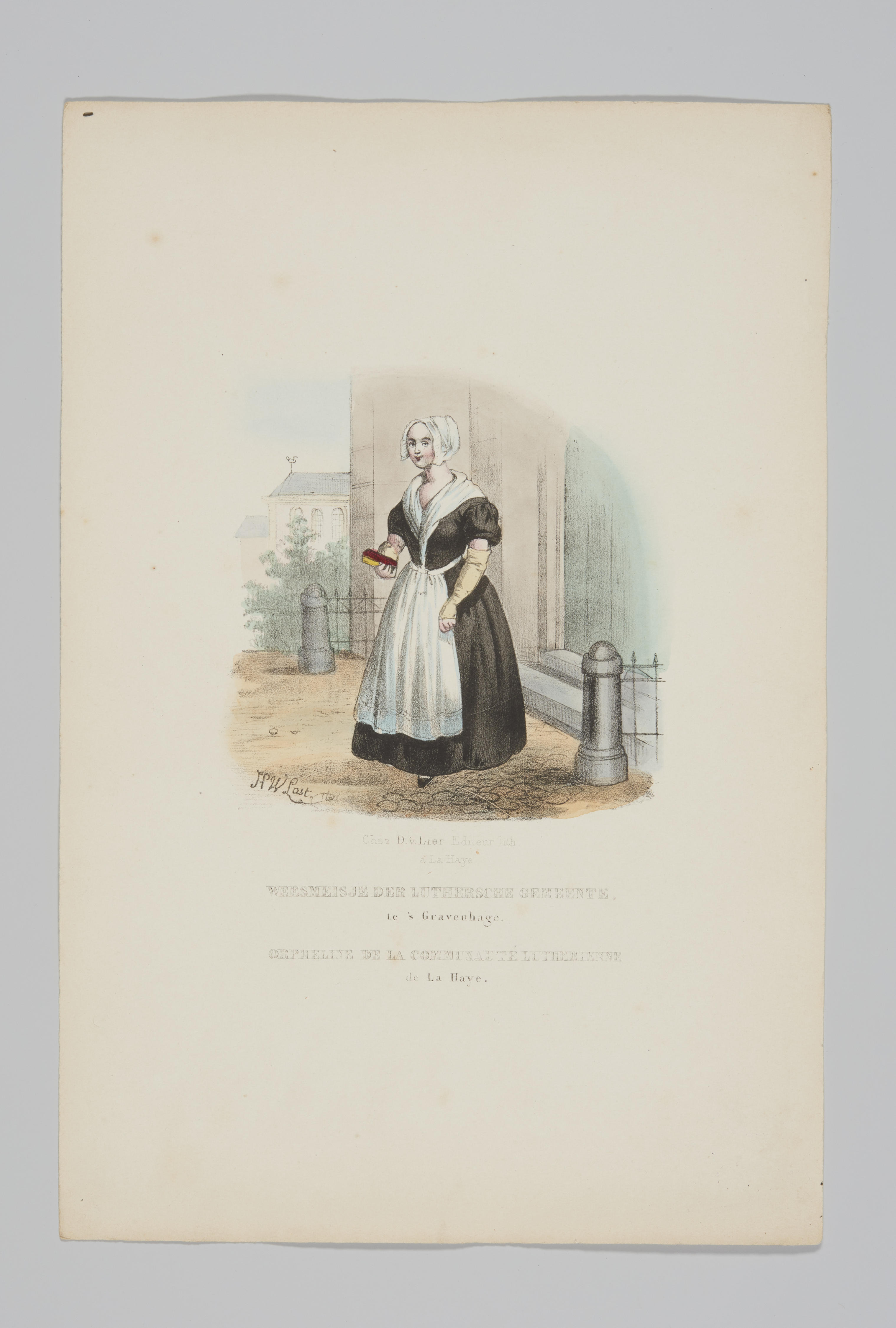 Prent van een luthers weesmeisje uit Den Haag. Het meisje is gekleed in een zwarte japon met een wit schort en een witte doek.