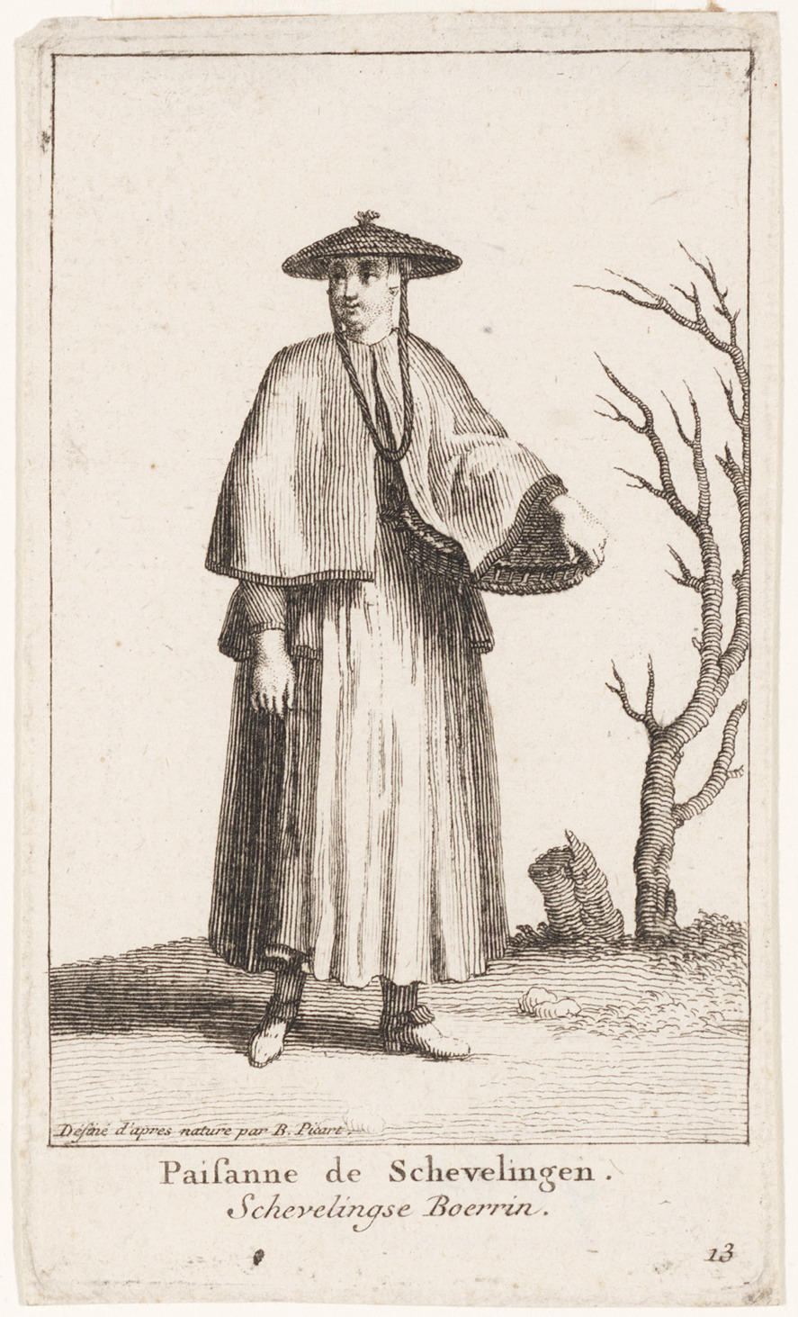Prent van een Scheveningse boerin met een mand onder de linkerarm.