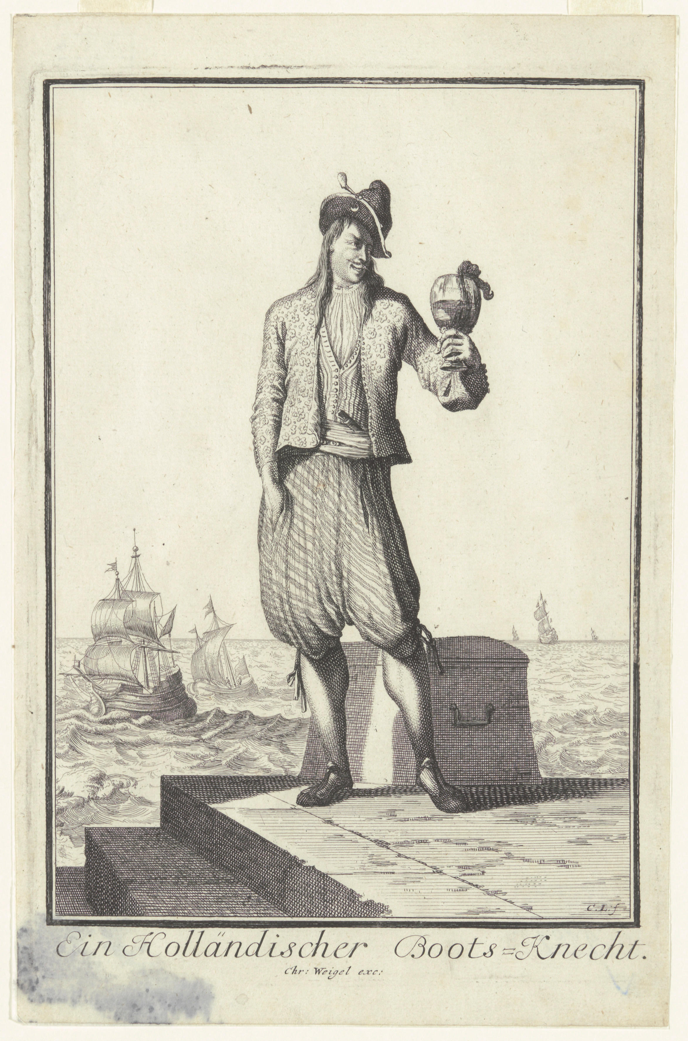 Prent van een man naast een zeemanskist op de kade. Dit is een van de honderd prenten in 'Neueröffnete Welt-Galleria', in 1703 in Neurenberg uitgegeven door Abraham a Sancta Clara. De kopergravure is vervaardigd door Christoph Weigel, naar een werk van Caspar Luyken.