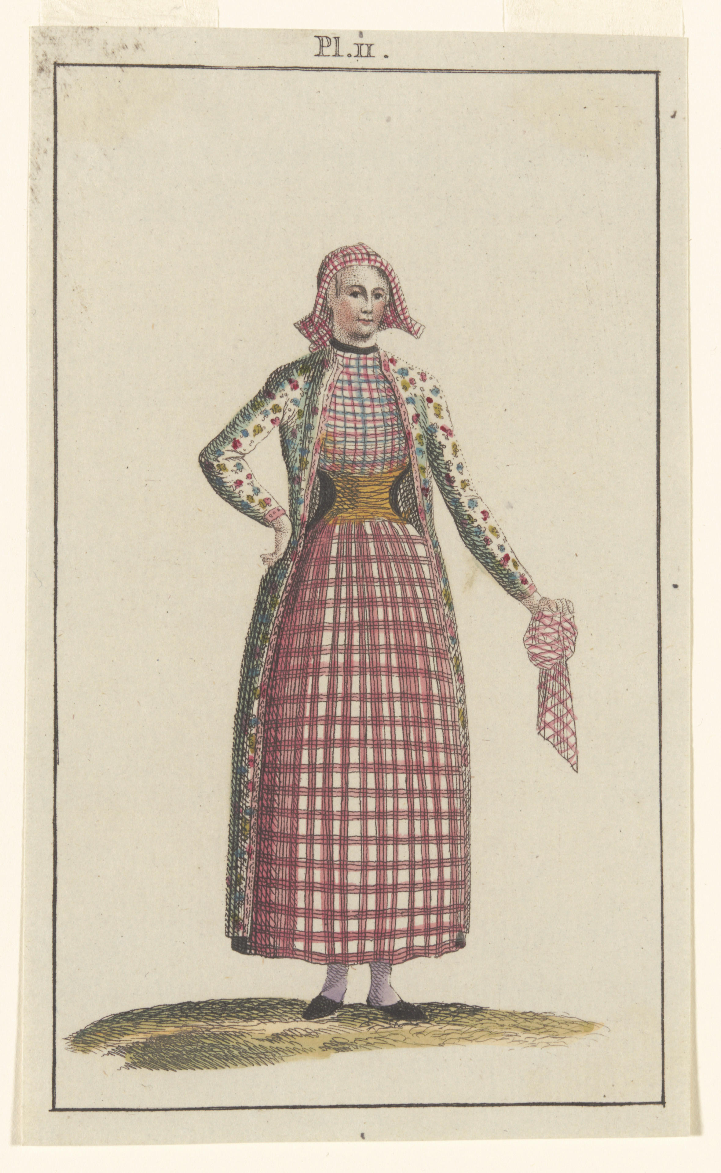 Ingekleurde gravure van een ongehuwde vrouw in Hindelooper streekdracht. Ze is gekleed in een lange sitsen jas, een zogenoemde wentke. Deze afbeelding werd gepubliceerd als illustratie in: Johann Jacob Grabner, Brieven over de Vereenigde Nederlanden, uitgegeven in 1792 in Haarlem.
