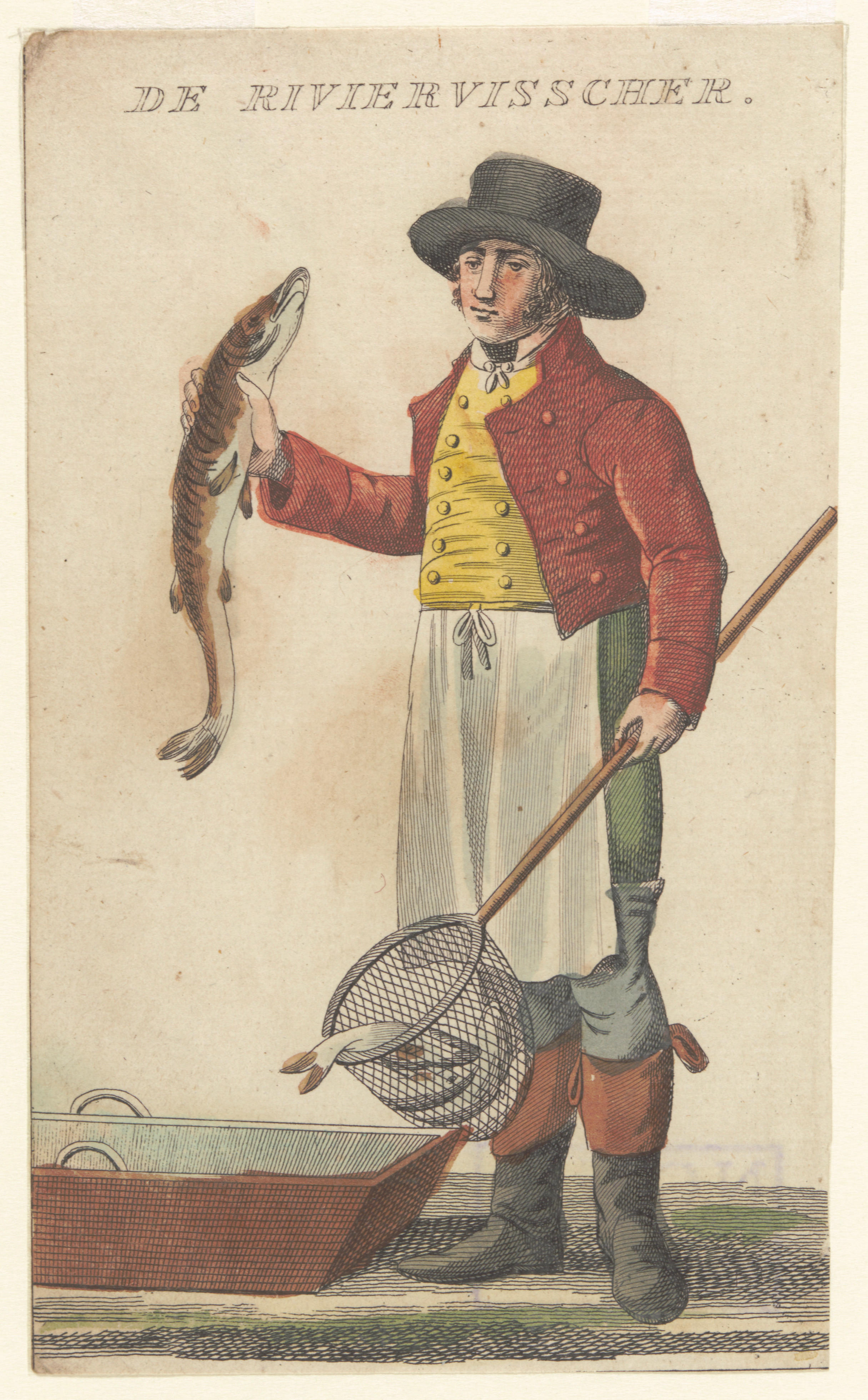 Ingekleurde gravure van een visser met een snoek in de ene hand en een schepnet met een vis in de andere hand. Hij is gekleed in een hemdrok en vest en lange broek met laarzen. Hij draagt ook een witte schort en een hoed. Op de grond staat een houten bak.