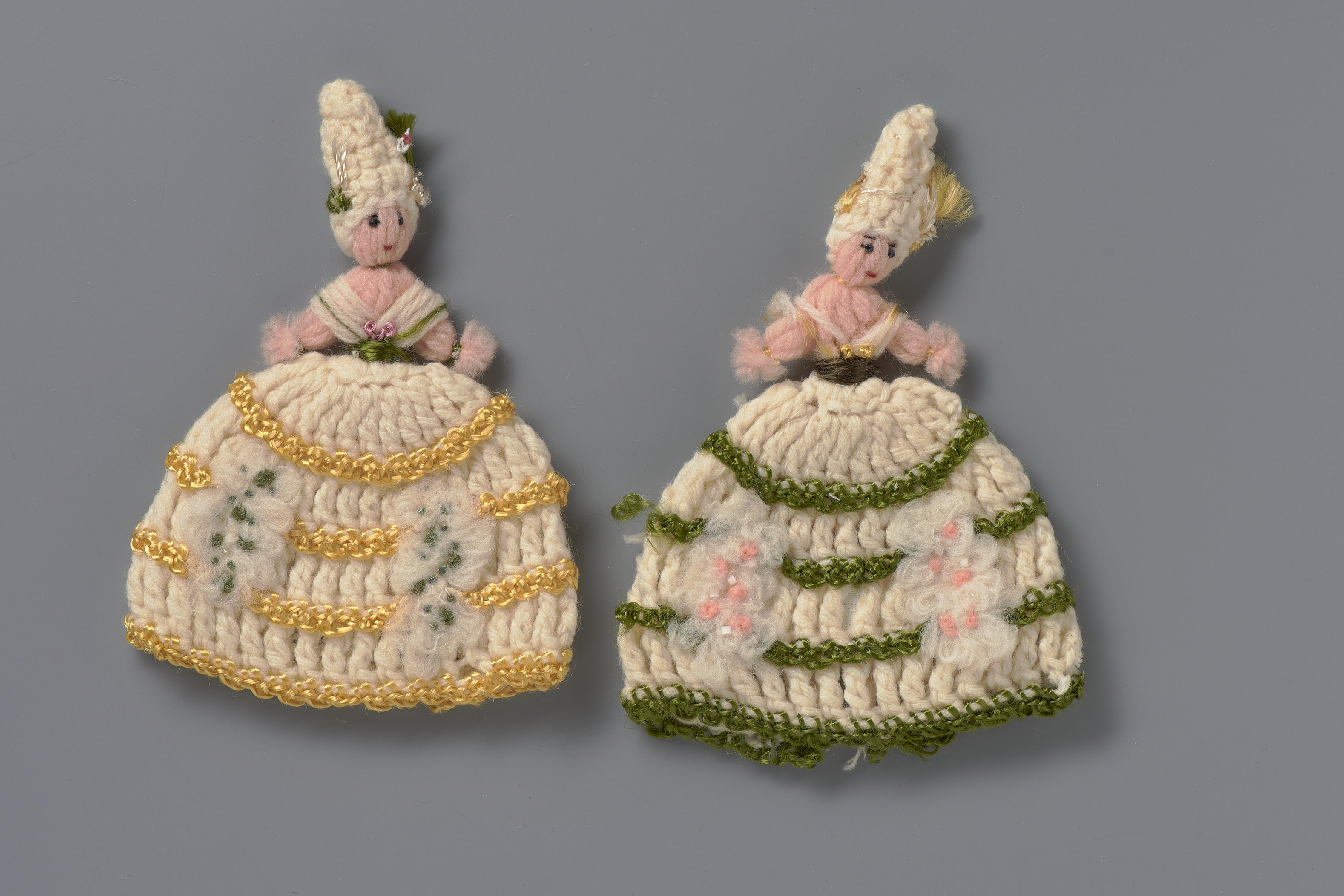 Twee gehaakte eierwarmers in de vorm van vrouwen met wijde jurken.
