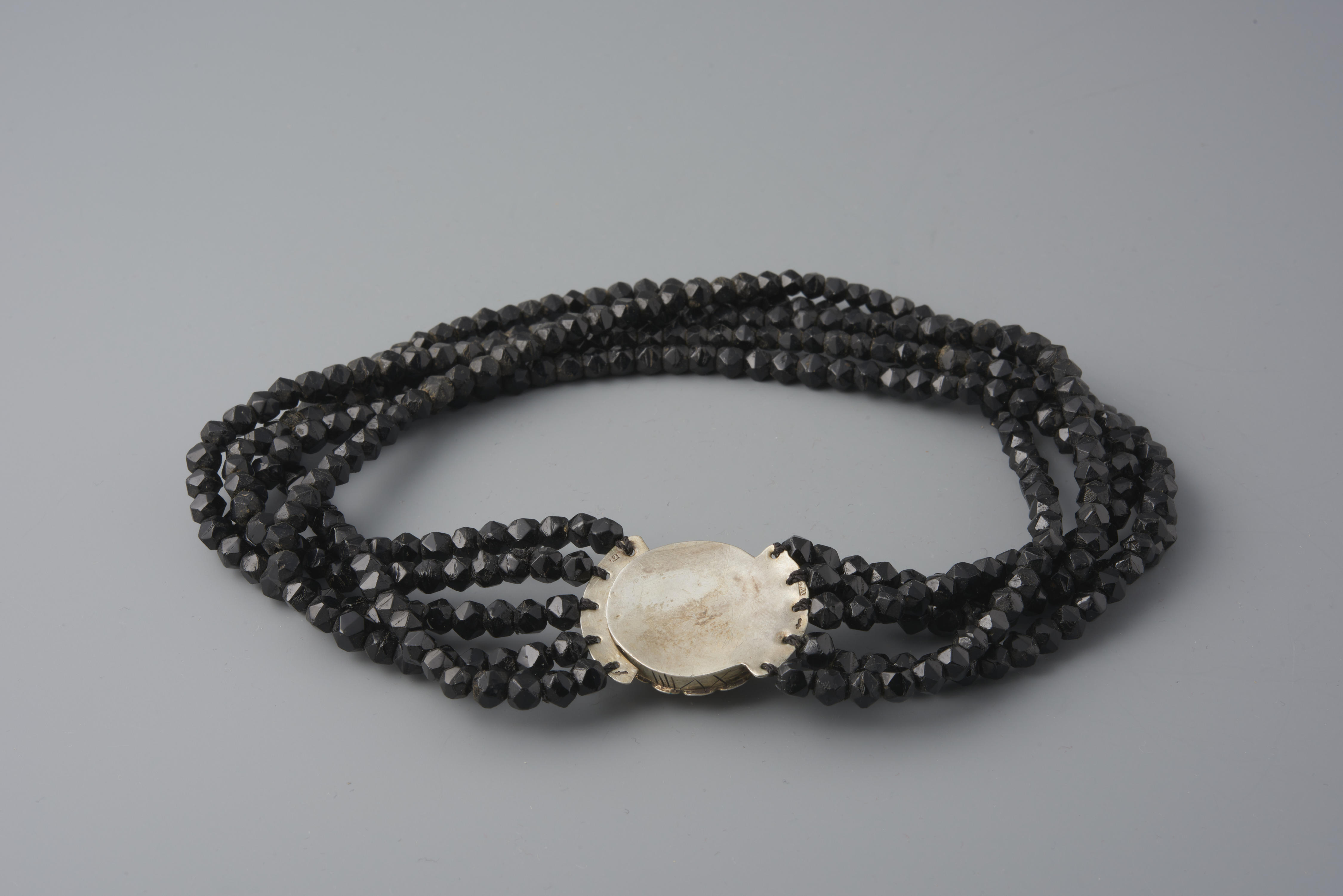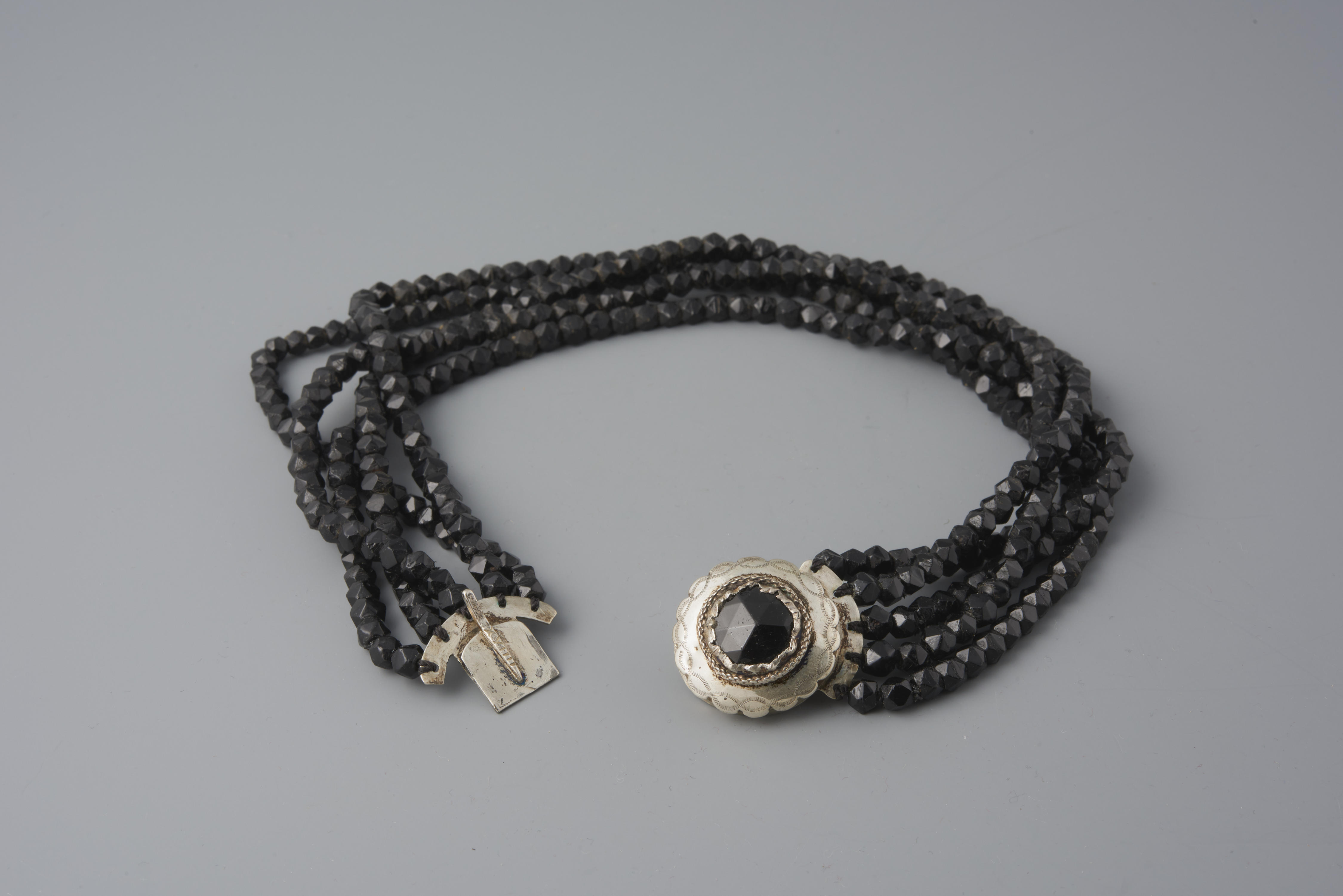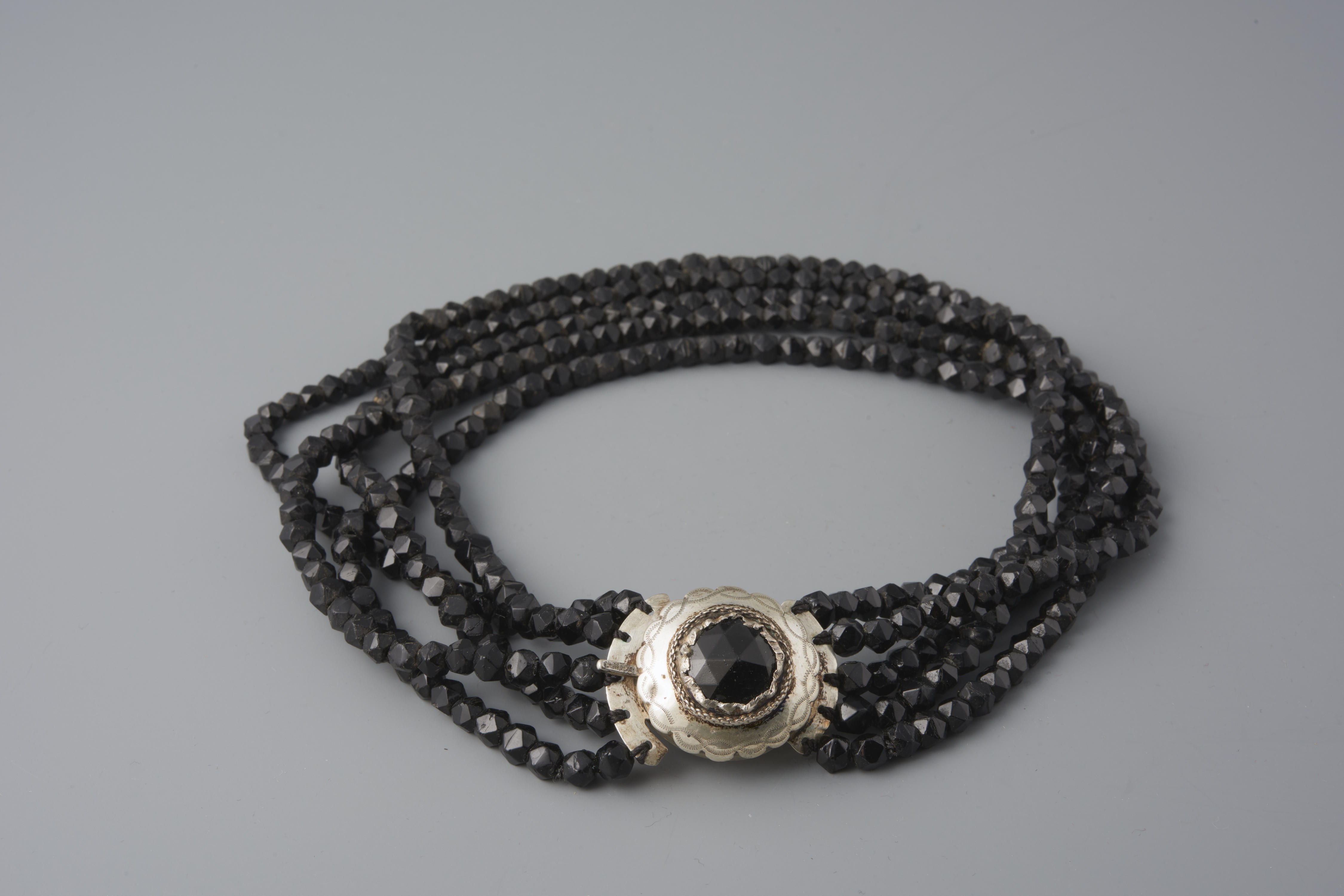 Halssnoer, bestaande uit vijf strengen gefaceteerde glazen kralen aan een zilveren knipslot. Dit soort halssnoeren werd gedragen door vrouwen uit Oldebroek bij de rouwdracht. Het meesterteken zou van twee verschillende edelsmeden afkomstig kunnen zijn: W. Kraak uit Heerenveen, werkzaam tussen 1907-1927 of W. Kruyt uit Schoonhoven, werkzaam tussen 1879-1896.
