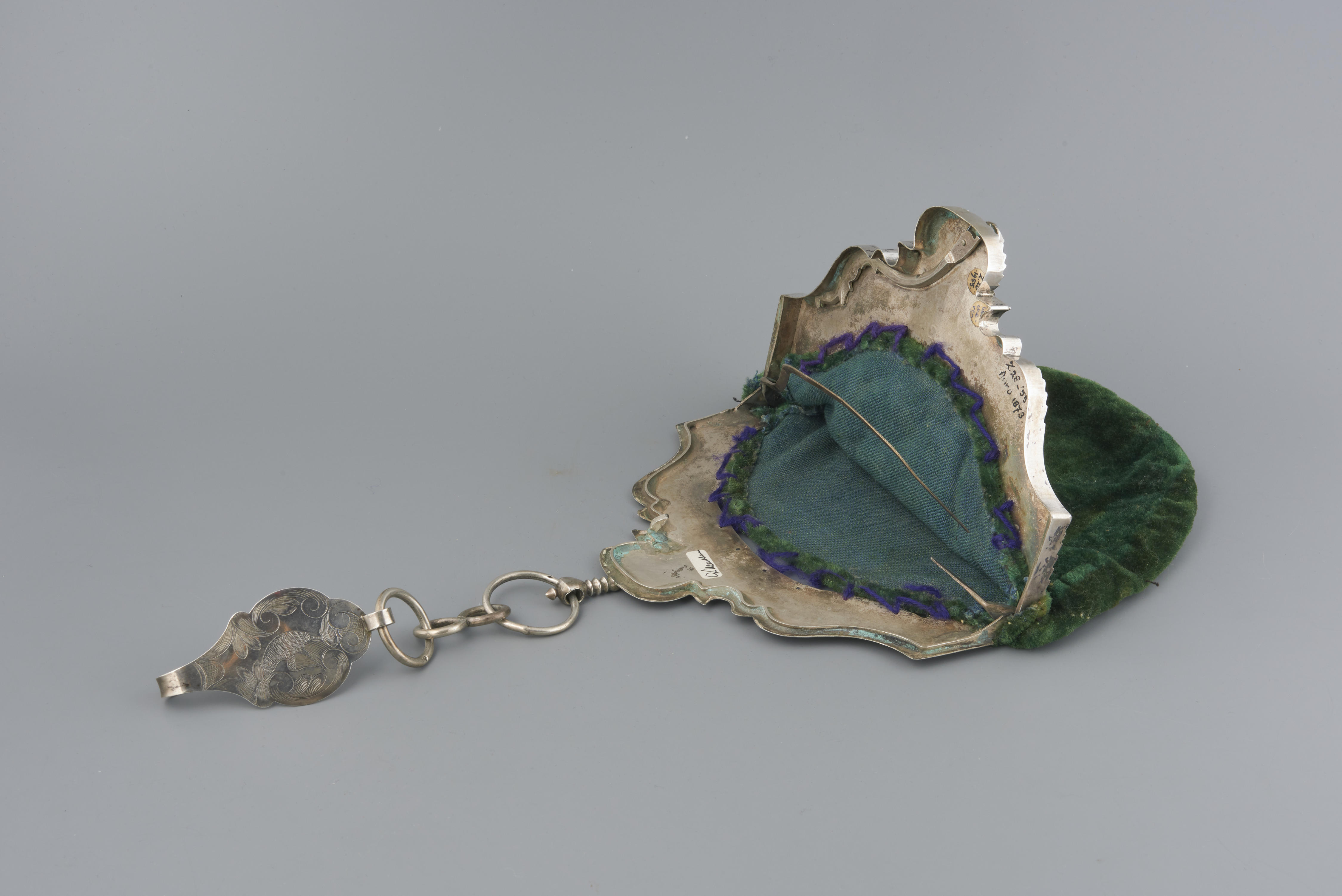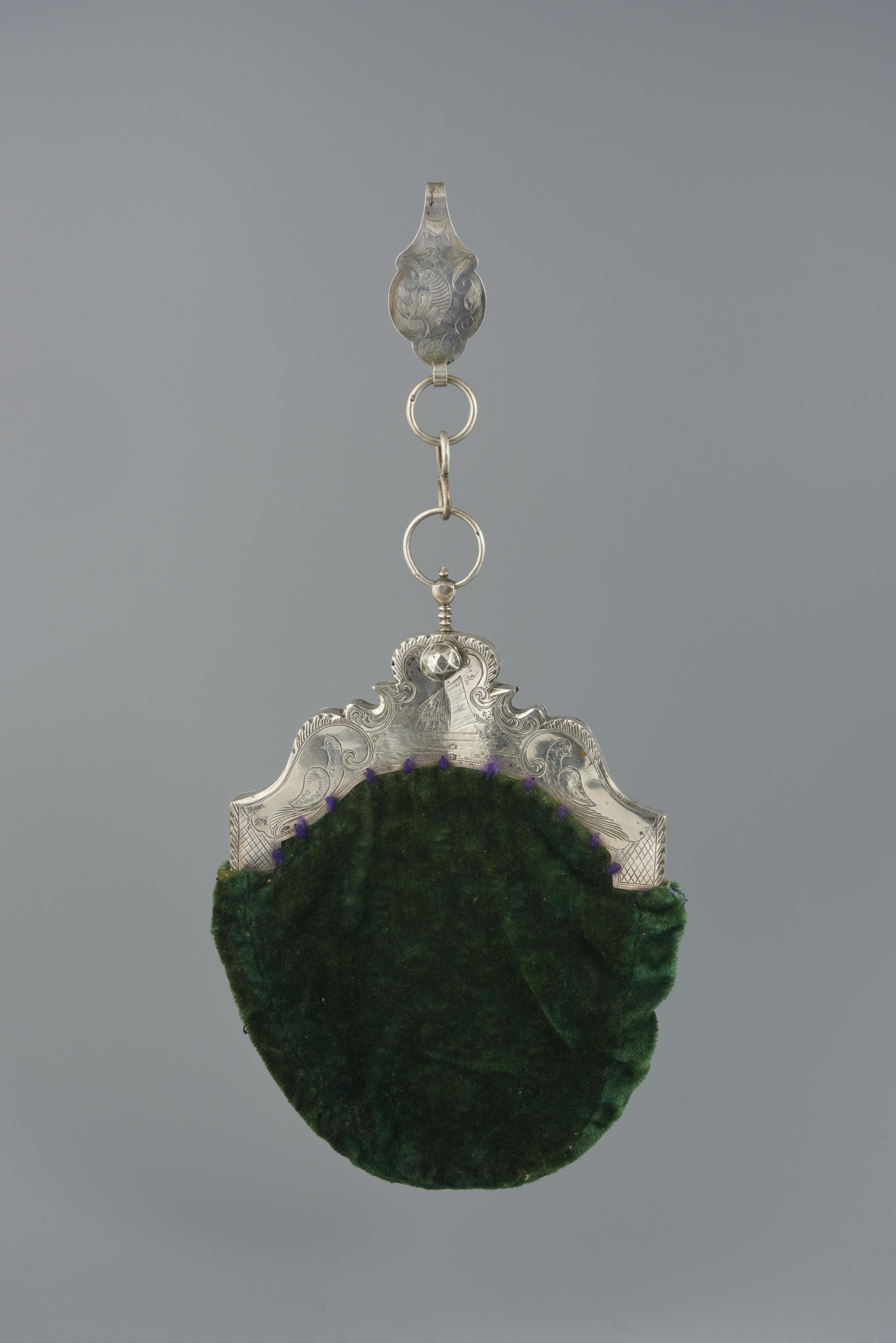 Beugeltas, gedragen door een vrouw van het eiland Walcheren. De haak is in 1873 vervaardigd door N. de Gidts uit Schoonhoven. De tasbeugel is in 1873 vervaardigd door C.A. Hackenberg uit Middelburg.