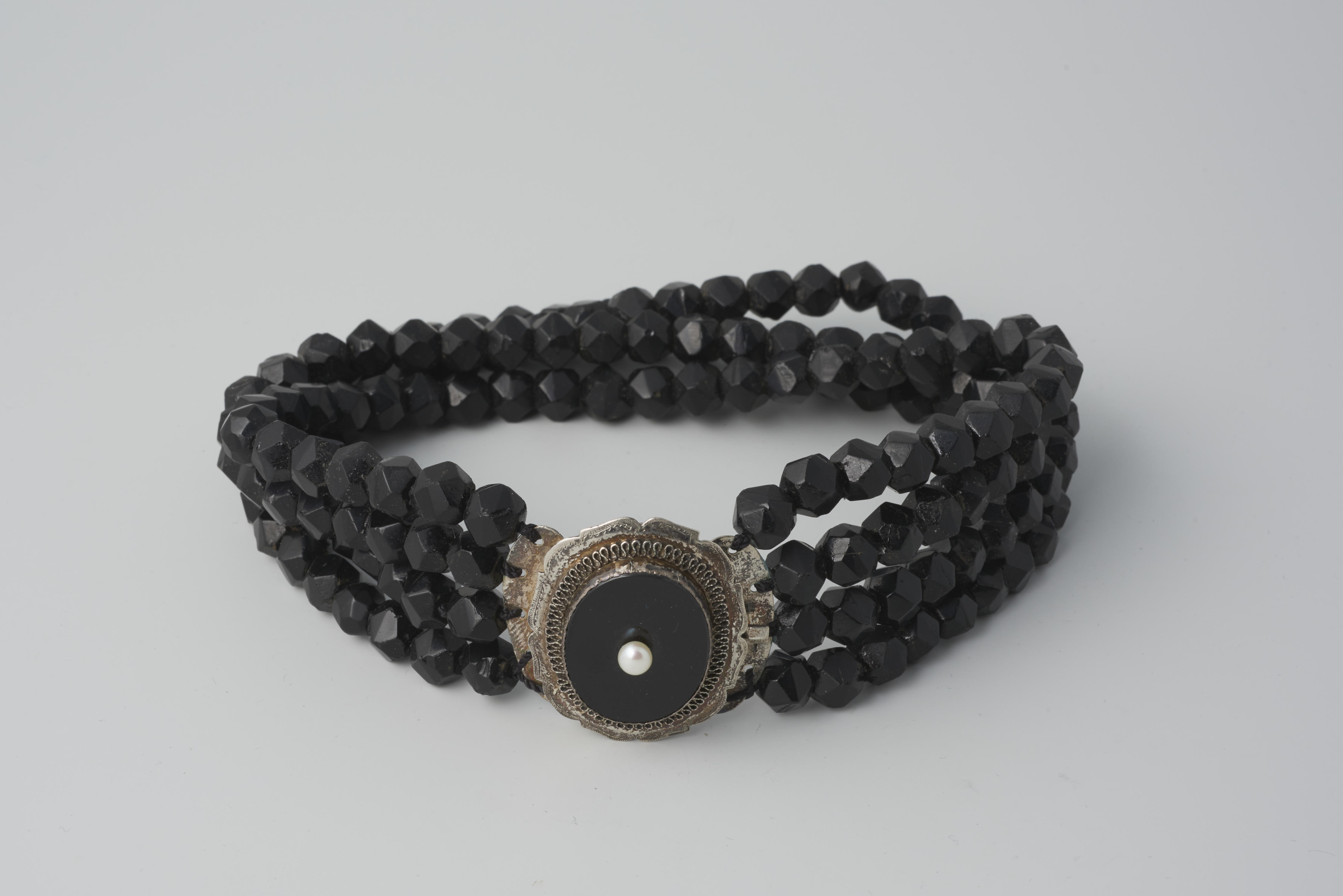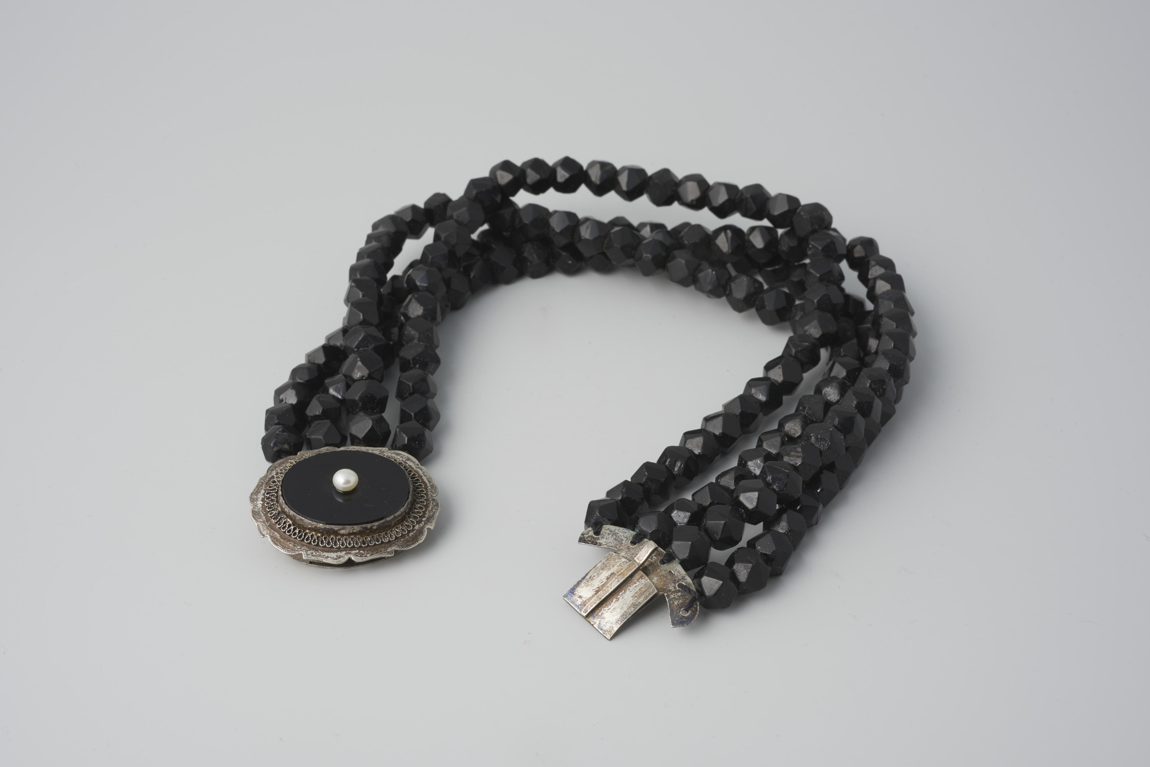 Halssnoer met zilveren slot en vier rijen gefacetteerde glazen kralen. Aan de achterkant van het slot zijn de initialen ‘J.v.D.’ gegraveerd. Het halssnoer is gemaakt omstreeks 1900 en gedragen door een vrouw van de Noord-Veluwe bij de rouwdracht. De vervaardiger van het slot is onbekend.