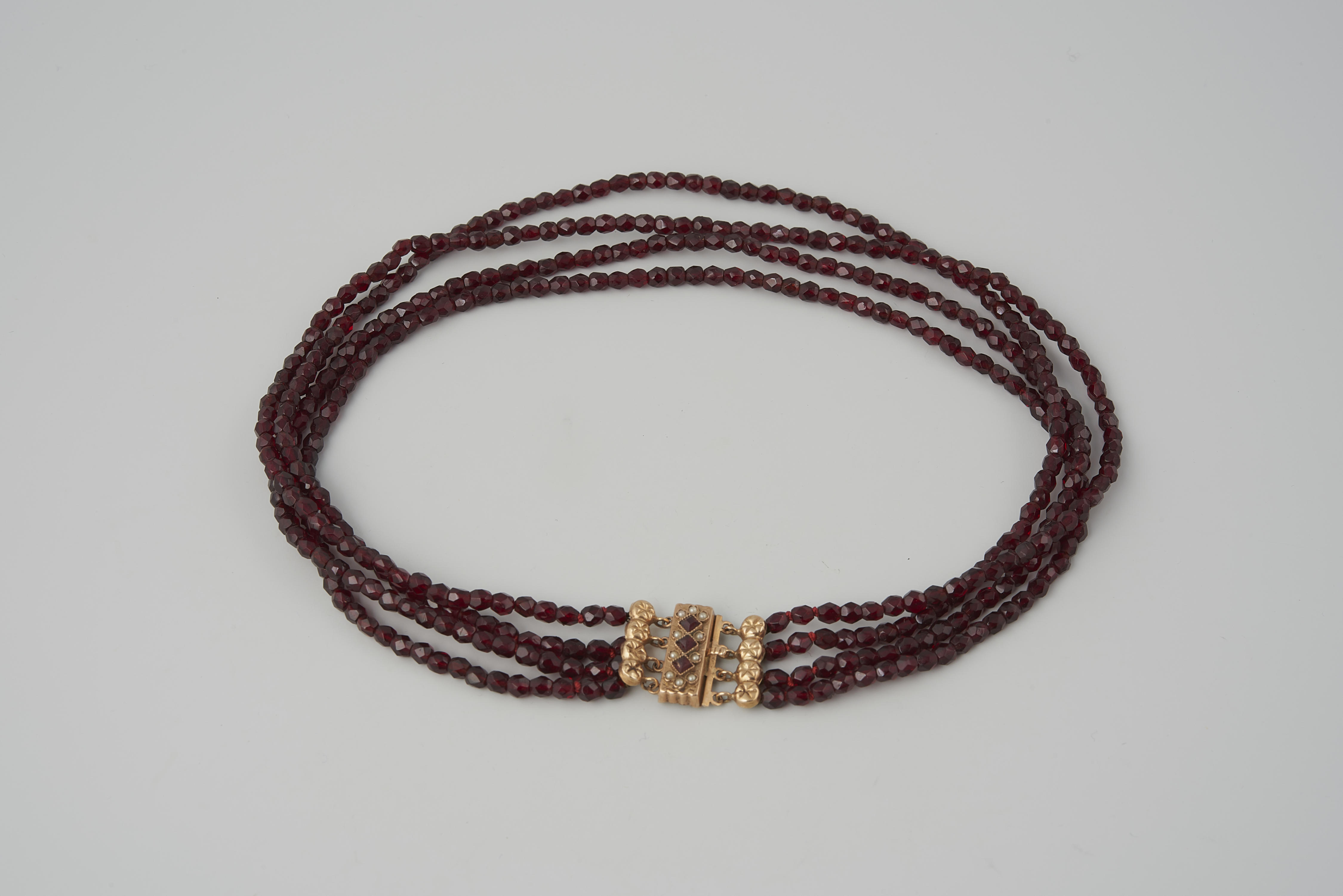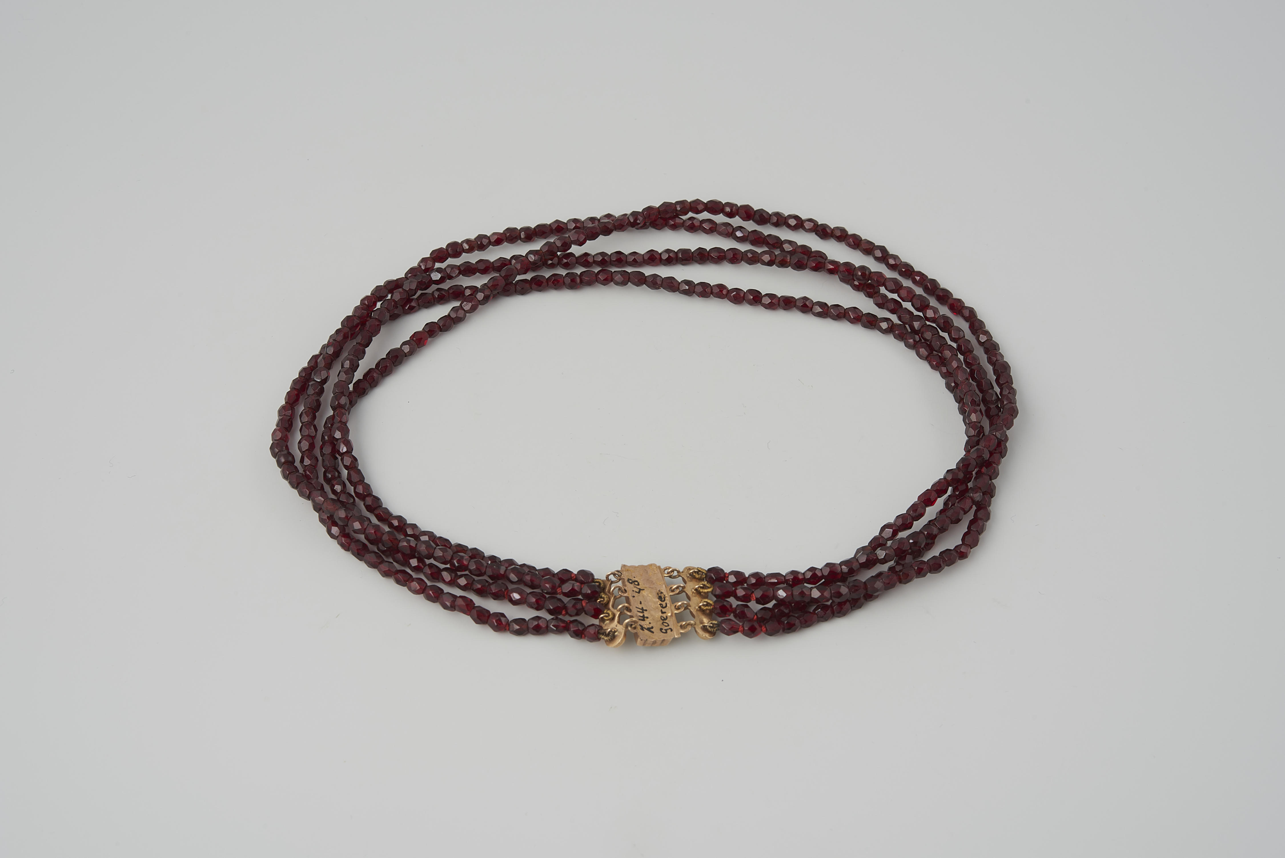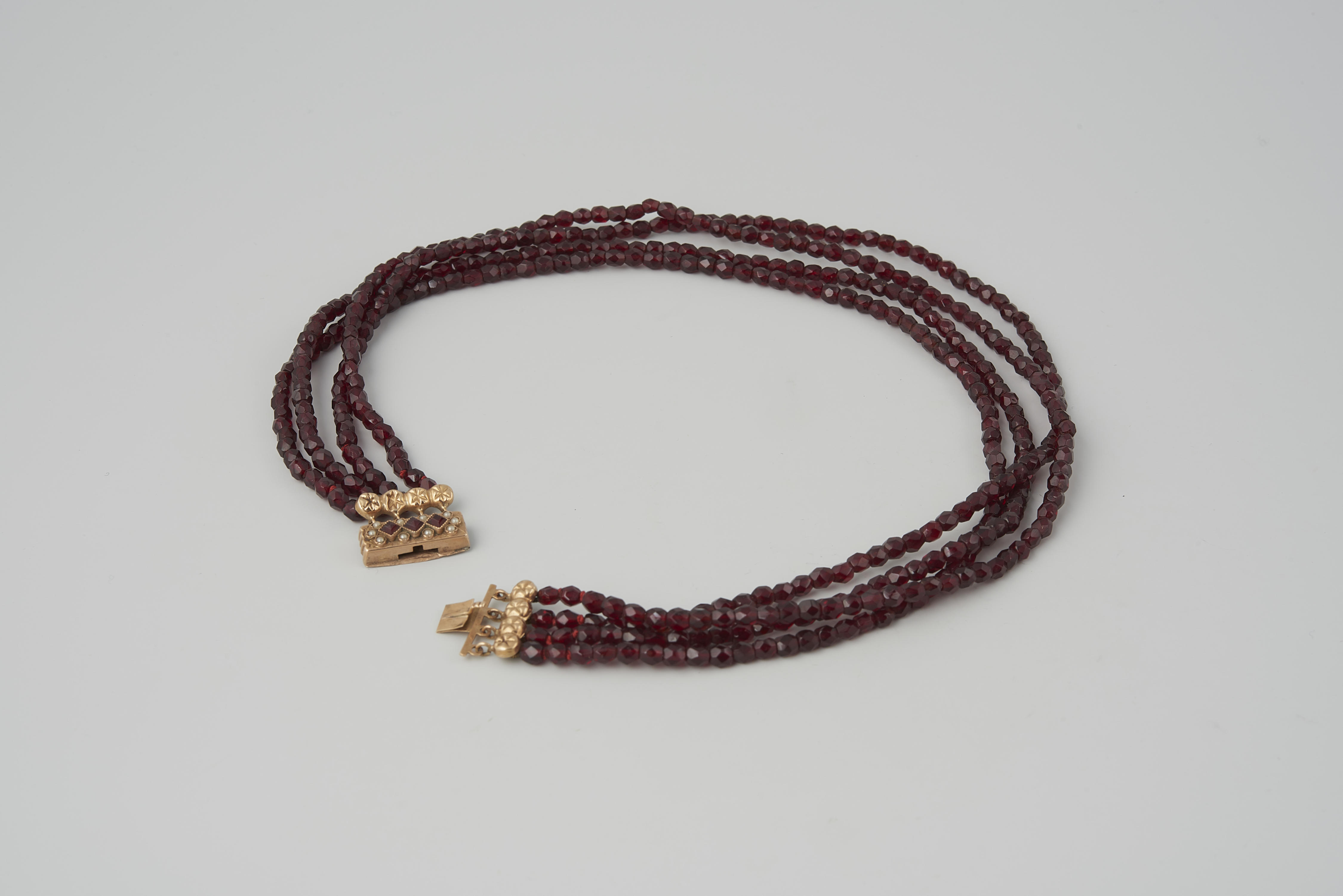 Halssnoer, bestaande uit vier strengen granaten kralen aan een 14-karaats gouden slot. Het slot is gemaakt omstreeks 1900 en gedragen door een vrouw van Goeree Overflakkee. De vervaardiger is onbekend. Dit type slot is niet specifiek voor een bepaalde streek en werd ook bij de algemene modedracht gedragen. Het slot is in 1948 door het ...