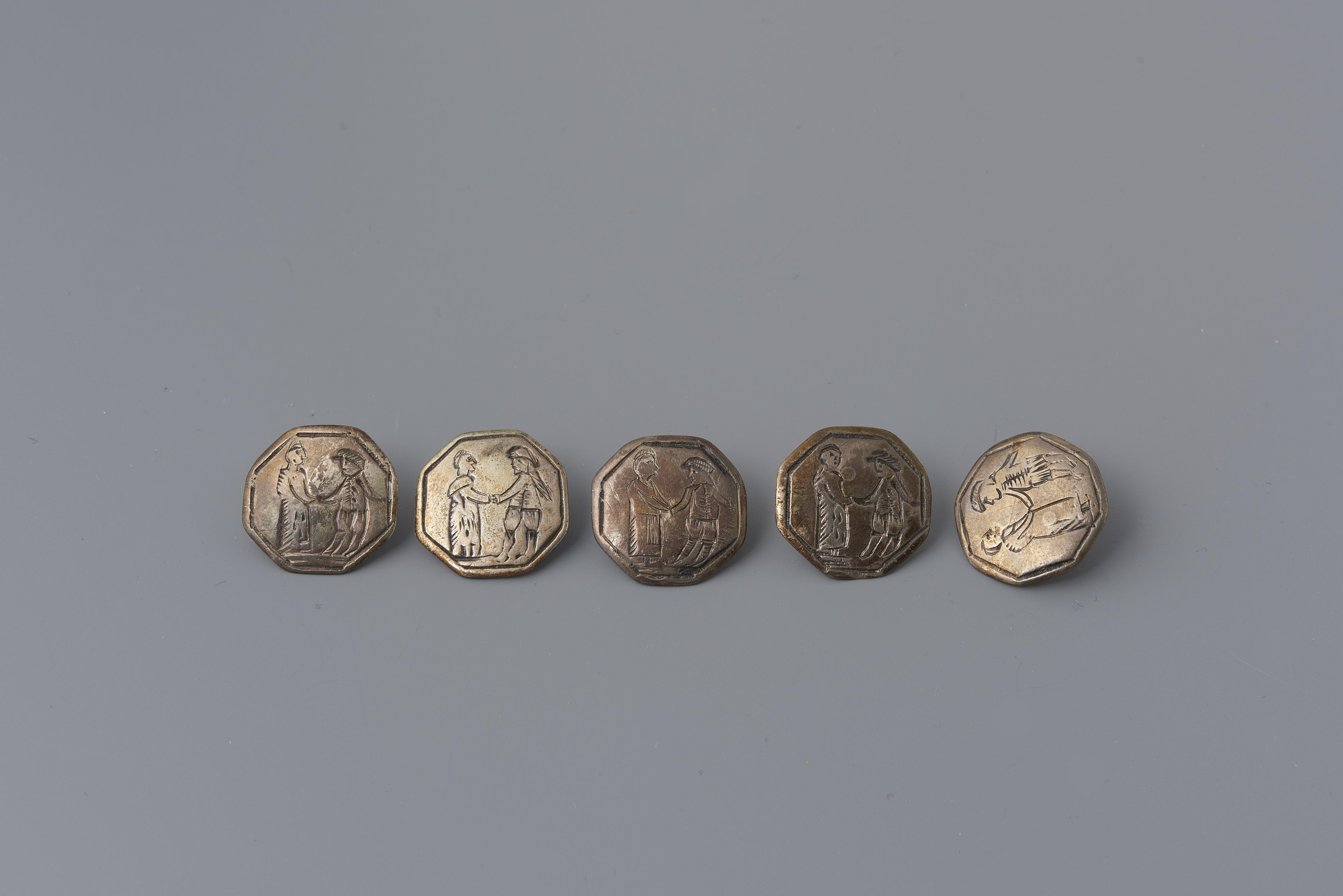 Vijf knopen van tweede gehalte zilver met een afbeelding van een man en een vrouw. Het meesterteken is niet leesbaar. De knopen hebben een gehaltemerk dat gebruikt is vanaf 1953, maar zijn vermoedelijk ouder.
