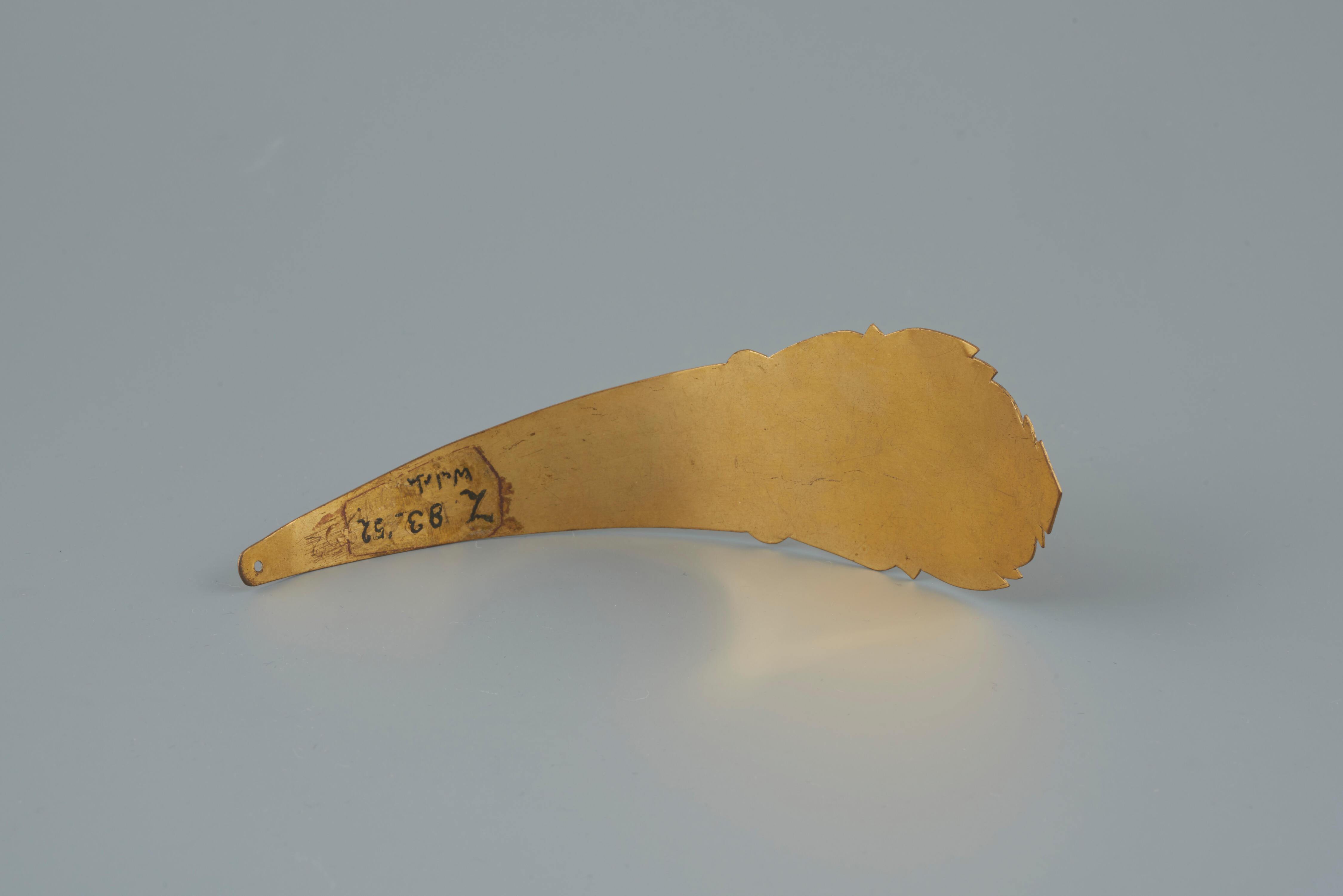 Voorhoofdsnaald van verguld messing, gedragen door een meisje in streekdracht van Walcheren. De voorhoofdsnaald draagt geen meesterteken.