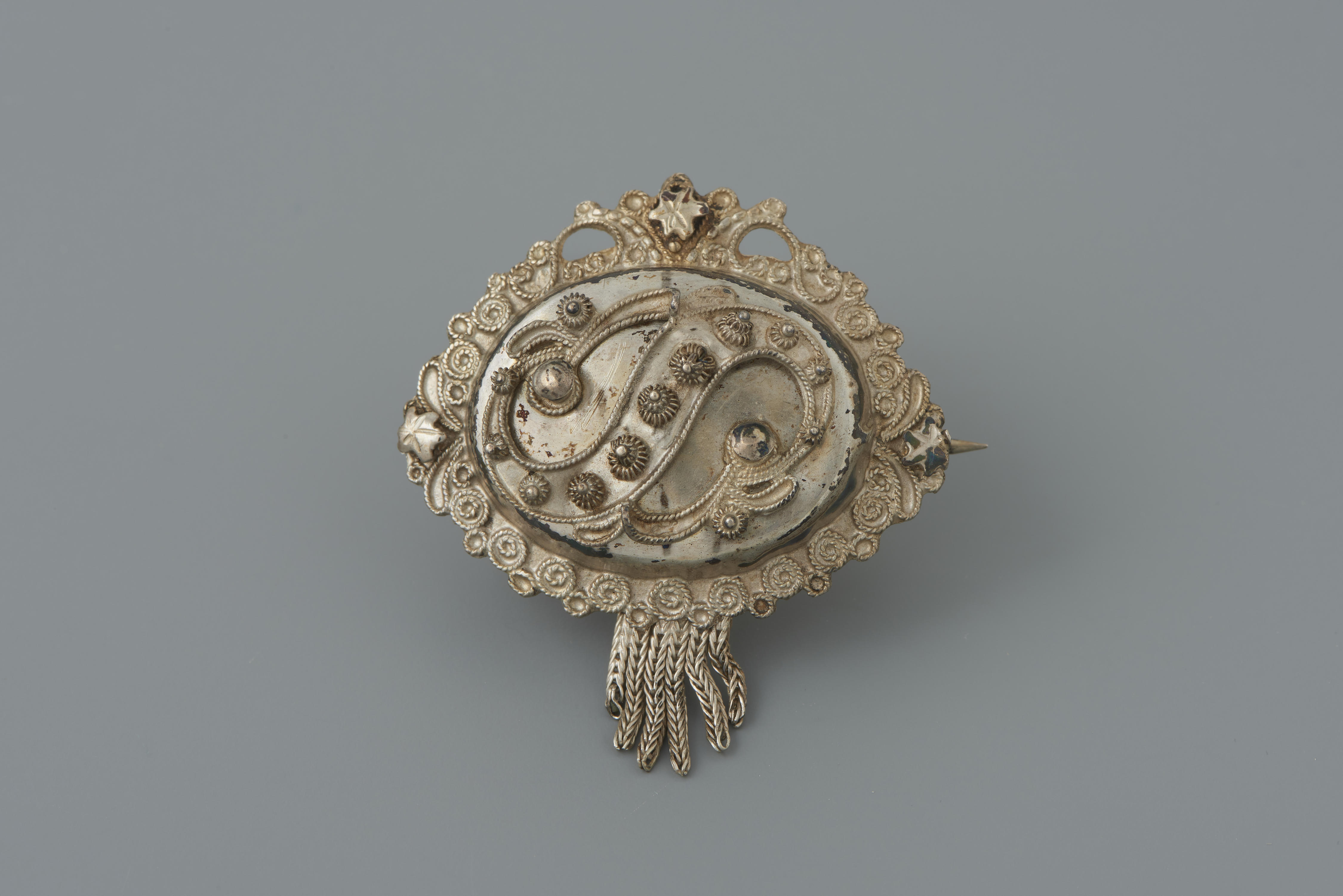 Zilveren broche, gedragen door een vrouw van het Kampereiland bij de lichte rouwdracht. Dit model werd ook op de Veluwe gedragen. De vervaardiger is onbekend. De broche heeft een gehaltemerk dat gebruikt is tussen 1906 en 1953.
