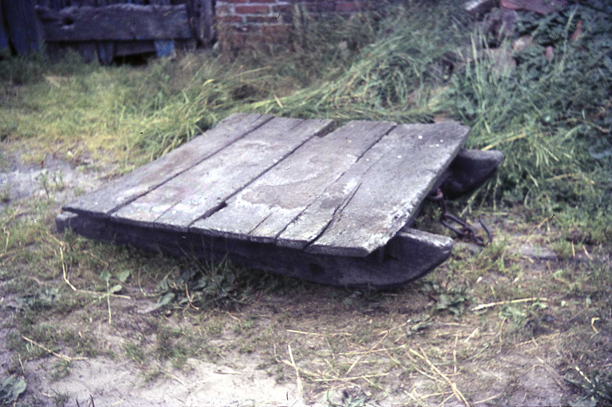 Een houten landslede op het erf van een boerderij in Ter Wupping.