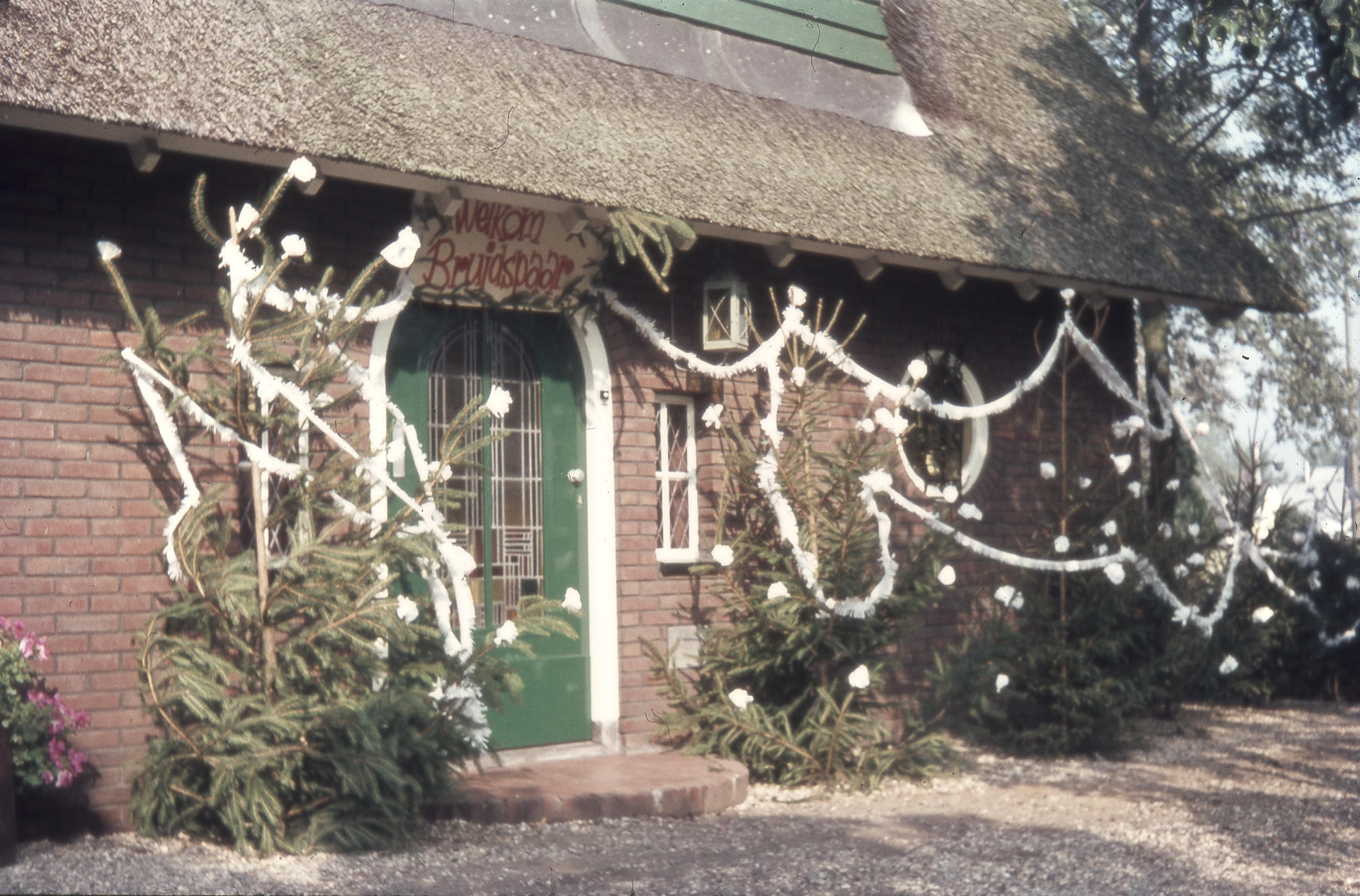 Op deze dia uit Doetinchem is een erehaag te zien rond de voordeur van het bruidspaar. Zo gauw bekend was dat twee mensen gingen trouwen, kwamen jongeren uit de buurt vragen of ze mochten ‘mooi maken’. Het mooi maken hield in dat er vier hoge dennenbomen voor de deur werden geplant, onderling verbonden met bogen ...