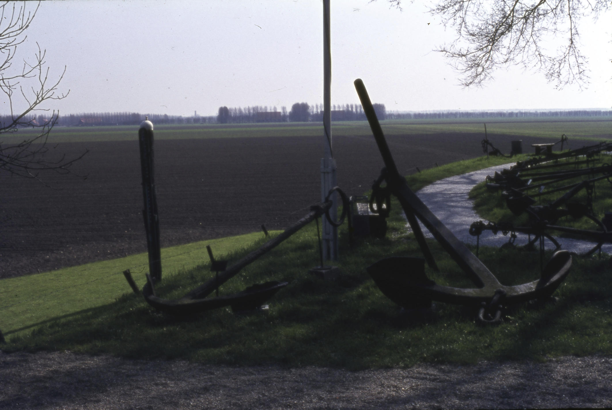 Uitzicht vanaf het voormalige eiland Schokland op de polder, met de oorspronkelijke houten hoogwaterpeilschaal en enkele ankers.