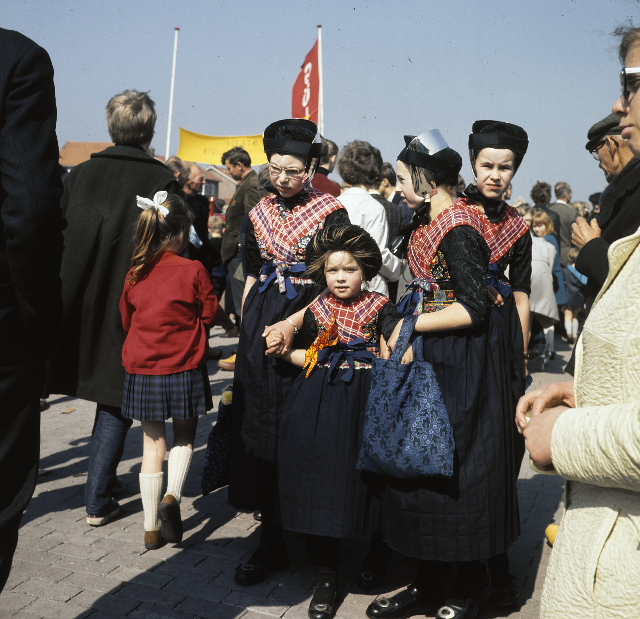 Meisjes op de jaarmarkt in Staphorst. Deze jaarmarkt wordt gehouden op de derde dinsdag van april. Van links naar rechts staan Rensje Balder, Femmigje Brakke, Jantje Brakke en Klaasje Lier. Het kleinste meisje draagt de 'nette', een zwarte kindermuts. De drie grotere meisjes dragen het zilveren oorijzer, maar zonder de gouden 'krullen'. Hieruit is op ...