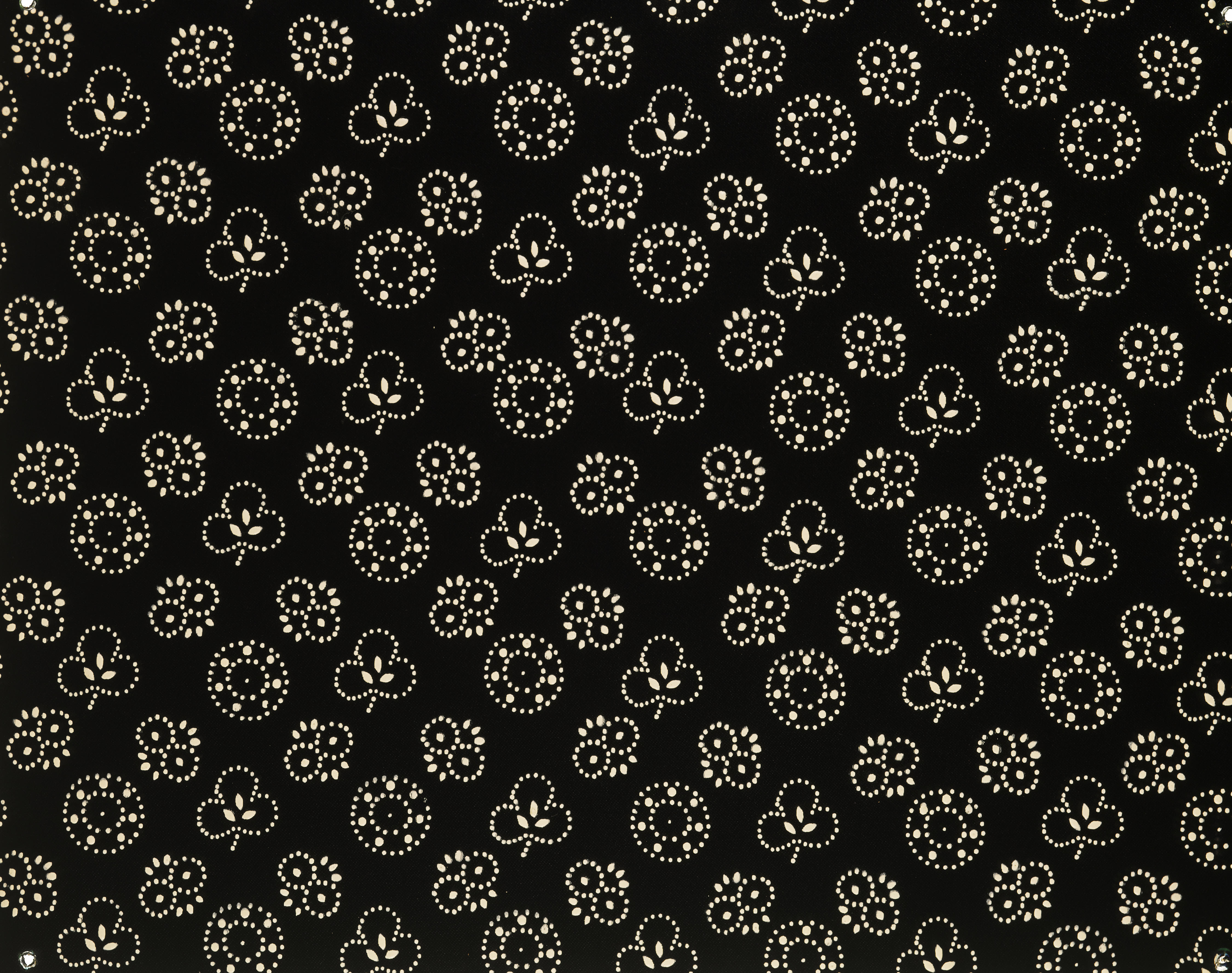 Detailopname van een stuk satijn, bedrukt met olieverf volgens de stipwerktechniek. Deze stof is voor in de zware rouw.