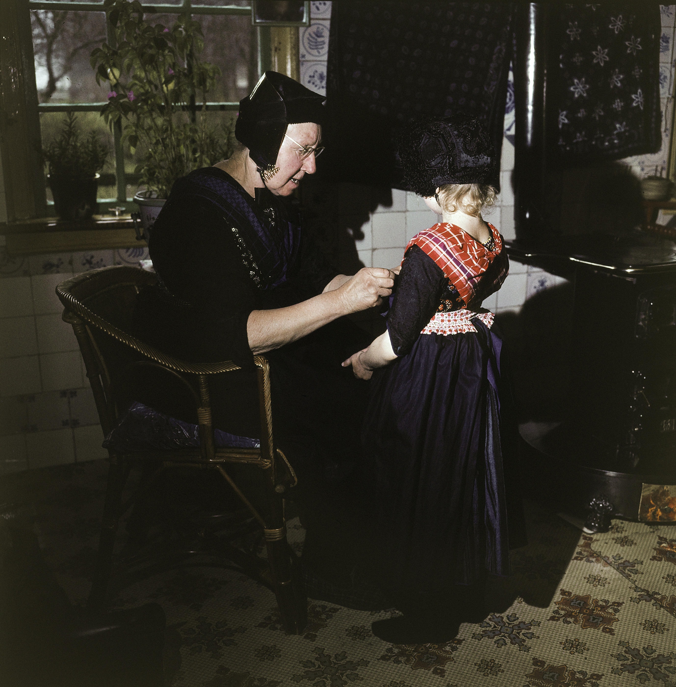 Niesje Compagner-Tromp helpt haar kleindochter met aankleden. Mevrouw Compagner draagt de opknapdracht voor de zware rouw, haar kleindochter voor uit de rouw. De kleindochter draagt de ‘nette’, een zwarte meisjesmuts.