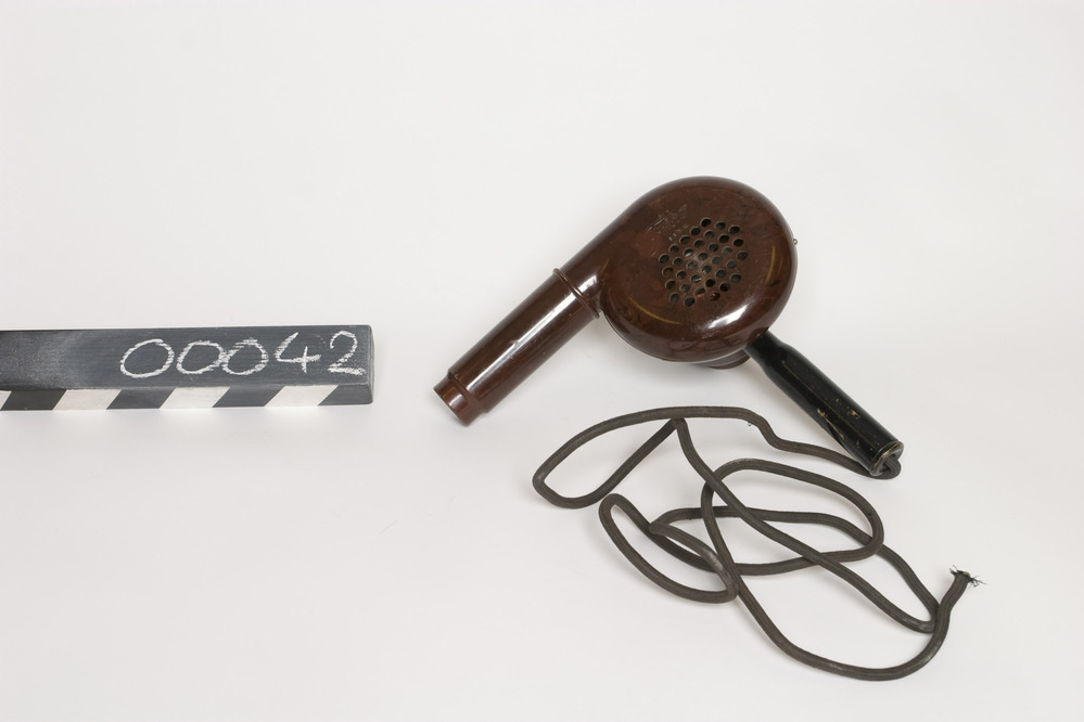 Friko haardroger met radiaalventilator en elektrische verwarming. In een ronde bruine kunststof behuizing met een zwart handvat waar doorheen een los stuk zwart textiel omwonden apparaatsnoer is bevestigd.