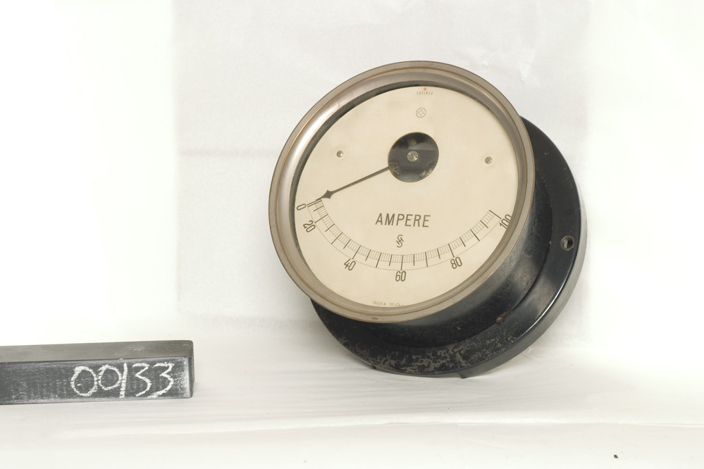 Siemens & Halske analoge opbouw weekijzer ampèremeter, schaal: 0 100 A. Serienr: 1371020. In een ronde zwarte metalen behuizing.