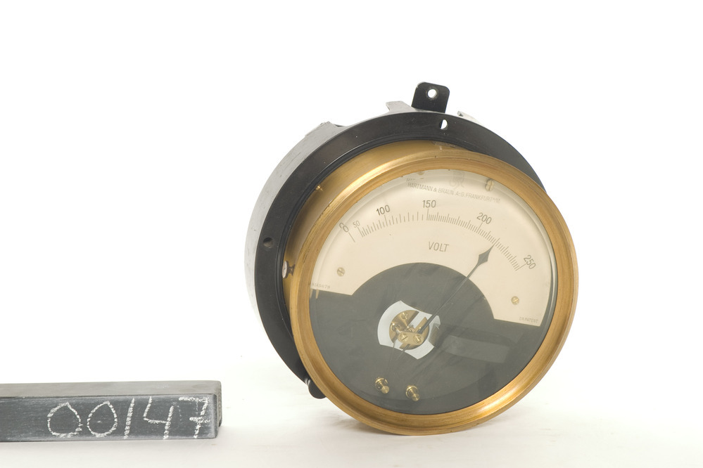 Hartmann & Braun analoge opbouw weekijzer voltmeter, schaal: 0 250V. In een ronde messing behuizing met zwart metalen voet. Serienr: 185679.