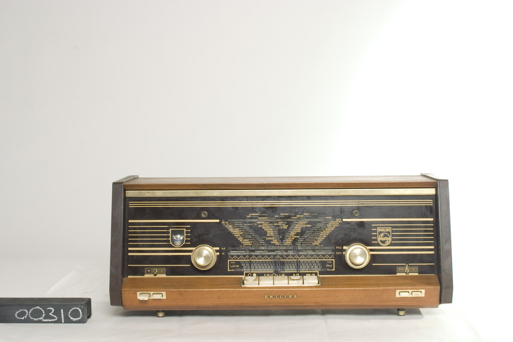 Philips Plano B4X23A radiotoestel, 110/245V - 55W, in houten brede kast, met glazen bruin paneel. Het paneel bestaat uit een transparant scherm voor zenderkeuze, heeft twee zilverkleurige draaiknoppen met dubbele gouden omranding en aan beide zijden dunne en dikke horizontale gele strepen over het glas lopen. Aan de onderzijde bevinden zich vier witte vierkante knoppen ...