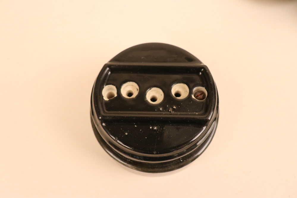 Siemens & Schuckert contactdoos, 250V - 6A, rond van zwart bakeliet, 3-polig met 3 ingebouwde veiligheden. Schenking van: Ghijsels.