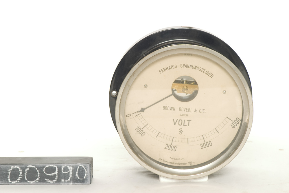 Brown Boveri analoge wisselstroom opbouw inductie voltmeter, schaal: 0 4000 V. In een ronde zwarte metalen behuizing. Te gebruiken met spanningstransformator 3400 100 V. Fabr.serienr: 545386.