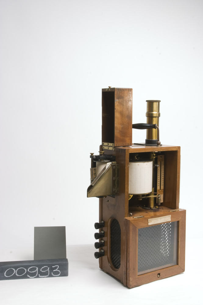 Hartmann & Braun analoge schrijvende voltmeter. In een verticale rechthoekige bruine houten kast. Fabr.seriern: 237058.
