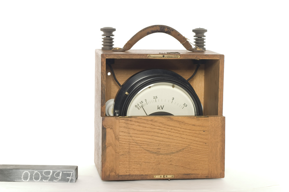 Onbekend fabricaat analoge opbouw weekijzer voltmeter, schaal: 0 3.5kV. In een ronde zwarte metalen behuizing. Geplaatst In een vierkante bruine draagkast met handvat.
