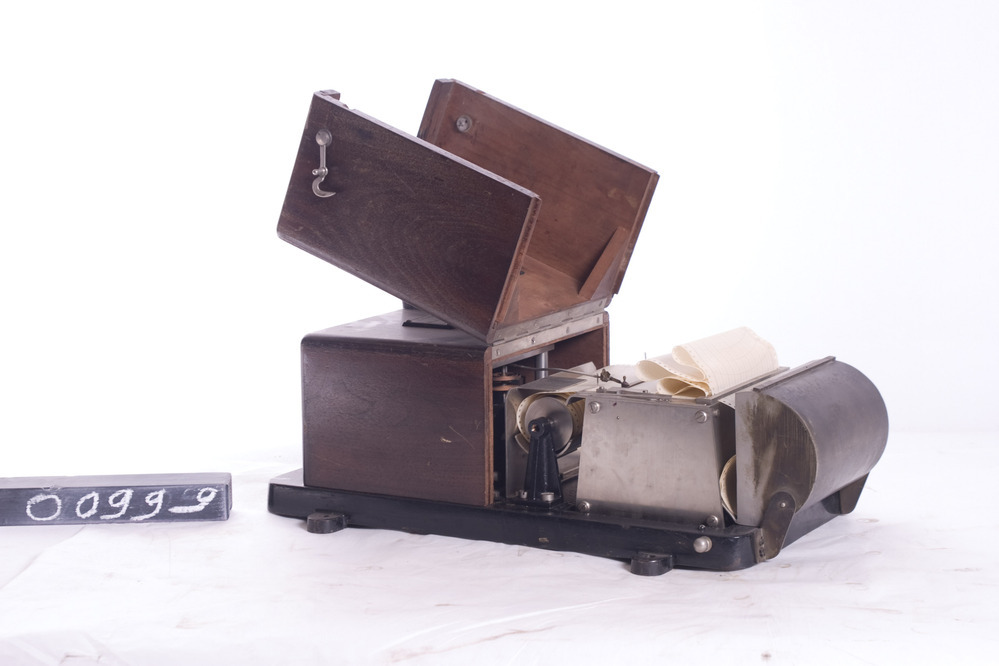 Onbekend fabricaat analoge schrijvende voltmeter. In een liggende rechthoekige bruine houten kast. Fabr.serienr: 164338.