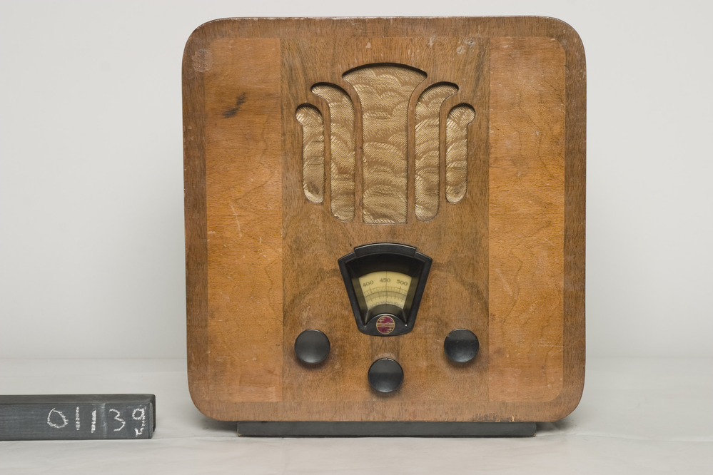 Philips Super Inductance 836A omroepontvanger, 110/240V - 40W, in lichtbruine vierkante kast met afgeronde hoeken. Het toestel heeft drie zwarte ronde knoppen met daarboven een zwart waaiervormig venster voor zenderkeuze. De speaker in de bovenhelft heeft een symetrisch uitgehouden versiering (vijf langwerpige krommende strepen die een cirkelvormig figuur vormen). Fabr.serienr: 40168K. (compleet goed werkend apparaat).