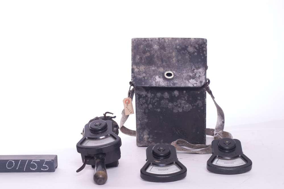 Crompton & Parkinson zwarte kunststof stroomtang met drie verwisselbare analoge weekijzer ampèremeters: een A meter schaal: 0 300 type B, een A meter schaal 0 200 type B en een A meter schaal 0 75 type B. Tezamn in een rechthoekige lederen draagtas. Uitgebracht door Brinck & Zn. Amersfoort.