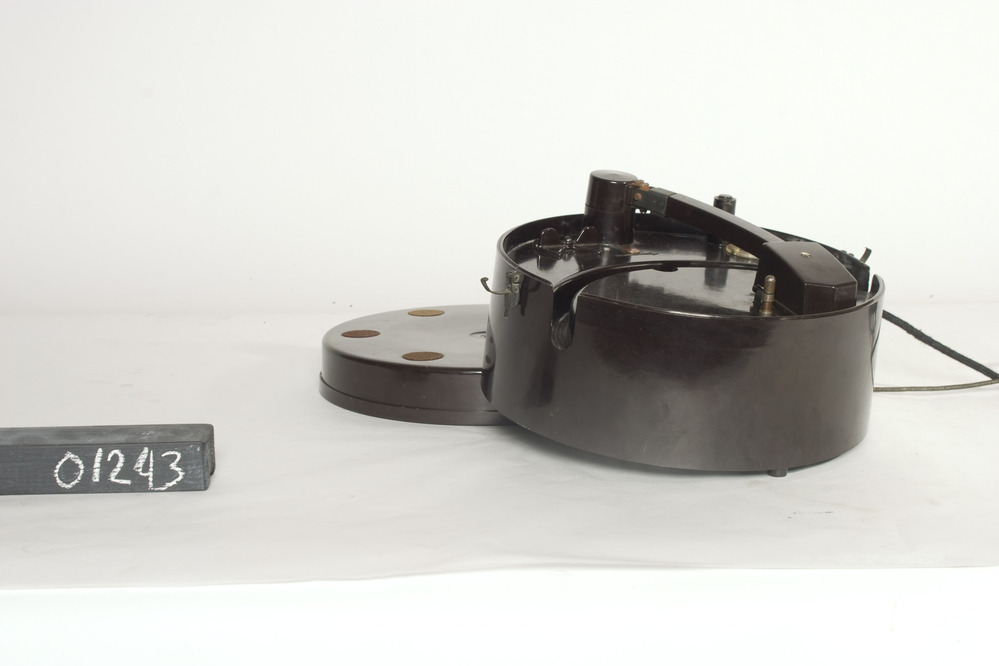Philips 3902 Porteldisc platenspeler, 220 V - 3W, in ronde donkerbruine kunststof behuizing met deksel, leren handvat en snoer. Op de onderkant van de speler staat een plaatje met 'PHILIPS, MADE IN HOLLAND, TYPE 3902, NR E49467, V220-245, HZ50. W3.'