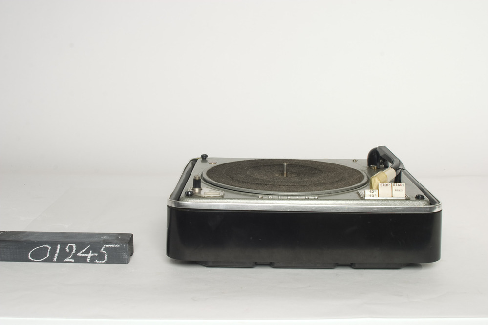 Philips AG2205 platenspeler, van metaal, in een zwarte kunststof kast met afgeronde hoeken. De speler heeft een met donkere stof beklede draaitafel, een kunststof zwart-witte arm met transparant beschermingskapje, een 'high fidelity' draaiknop aan de linkerkant en drie witte knoppen om te starten aan de rechterkant. Aan de achterkant van de speler zit een plaatje ...