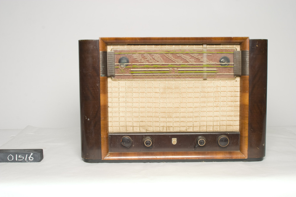 Philips Tropenradio BX716X omroepontvanger, 110/245V - 77W, in brede houten kast zonder achterwand. Het toestel heeft donkerbruine zijkanten met een lichtere tint hout aan de binnenkant, een glazen paneel voor zenderkeuze met crèmekleurige en groene opdruk en twee ronde lampen, en beneden aan de voorzijde vier kunststof draaiknoppen met daar tussenin het Philips logo. Fabr.serienr: ...