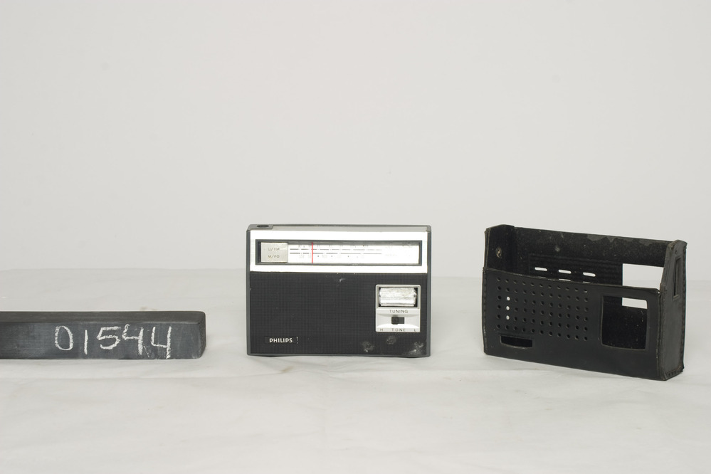 Philips Blues 90RLR194 draagbare omroepontvanger, in kunststof zwarte kast met lederen tasje. Het toestel heeft aan de bovenkant een zilverkleurig paneel met transparant venster voor zenderkeuze, daaronder een zwart raster voor het geluid met rechts een grijs draaimechaniek voor 'tuning' en een zwarte schakelaar voor 'tone'. Linksonder op het raster staat 'PHILIPS'. (FM werkt niet, ...