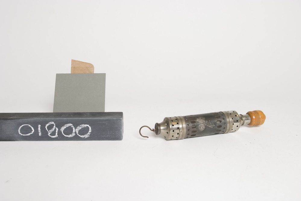 Luciole kastverwarmer met een elektrische verwarmingselement, 110V 100W, in een cilindervormige metalen behuizing met aan de voet een ronde blank houten knop waar doorheen een snoer kan lopen en aan de top een haak waarmee het in een kledingkast kan worden opgehangen. Door de gaatjes in de zijwand kan de verwarmde lucht de kast instromen ...