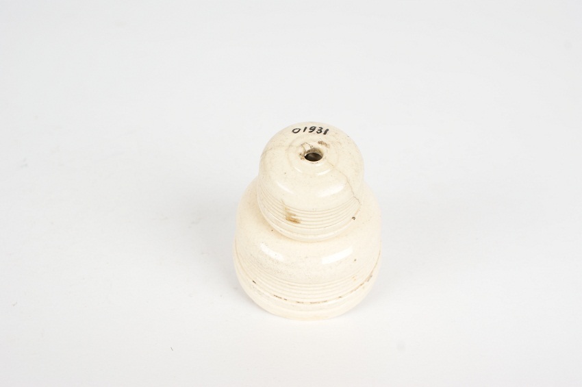 Busch contactdoos 6A, van wit porselein, met contactstop (doos heeft twee ronde gedeeltes, waarbij de onderkant breder is).