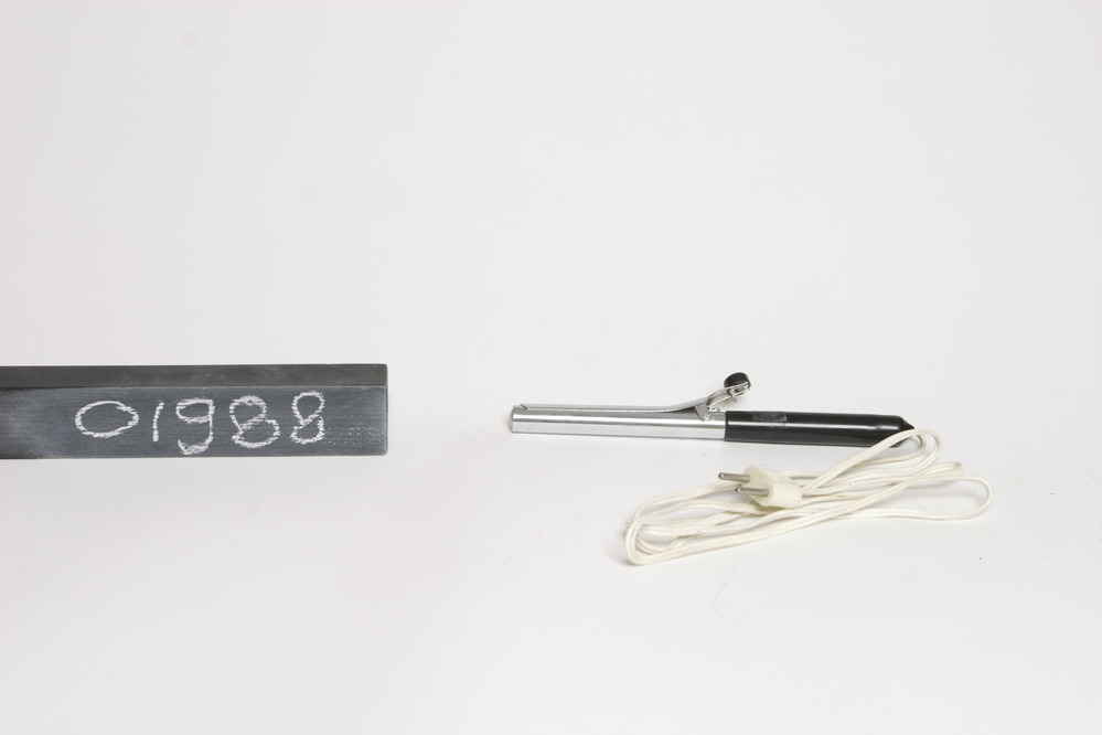 Onbekend fabricaat krultang met elektrische verwarming, 259V. In een langwerpige cilindrische verchroomd metalen behuizing met een zwart kunststof handvat, waaraan een twee aderig wit kunststof apparaatsnoer met een rechthoekige witte kunststof contactstop is bevestigd.
