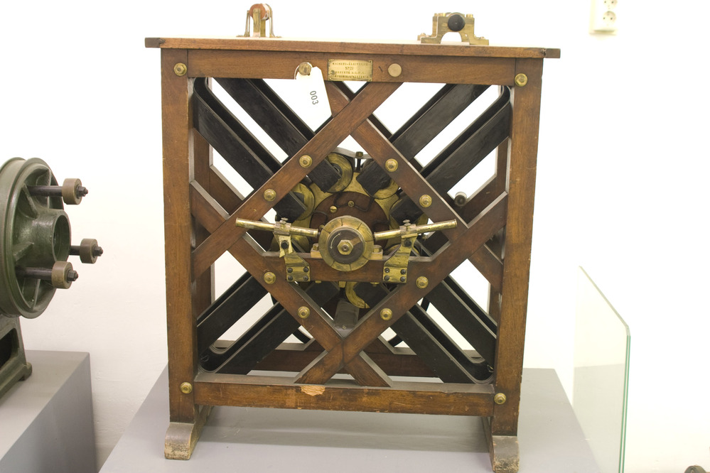 Société de l'Alliance dynamo. Een met handkracht door middel van een slinger aan het draaien gebrachte dynamo volgens een ontwerp uit 1850 van Floris Nollet. Een mahoniehouten raamwerk van 95*80*45 cm met daarbinnen acht permanente zwarte hoefmagneten (de stator) en een draaibare schijf van hout en messing (de rotor van de dynamo). In die schijf ...