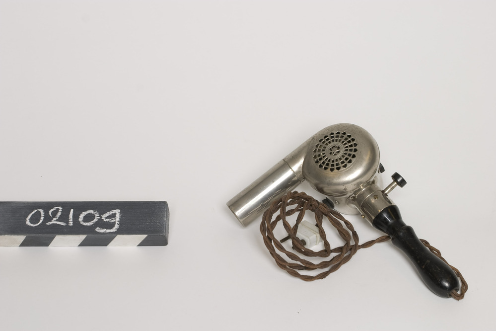 Onbekend fabricaat haardroger met radiaalventilator en elektrische verwarming, 220V. In een ronde vernikkeld metalen behuizing met een zwart houten handvat waar doorheen een twee aderig bruin textiel omwonden apparaatsnoer met platte witte porseleinen contactstop is bevestigd. Fabr.serienr: 35439. DRP 4 DRGM