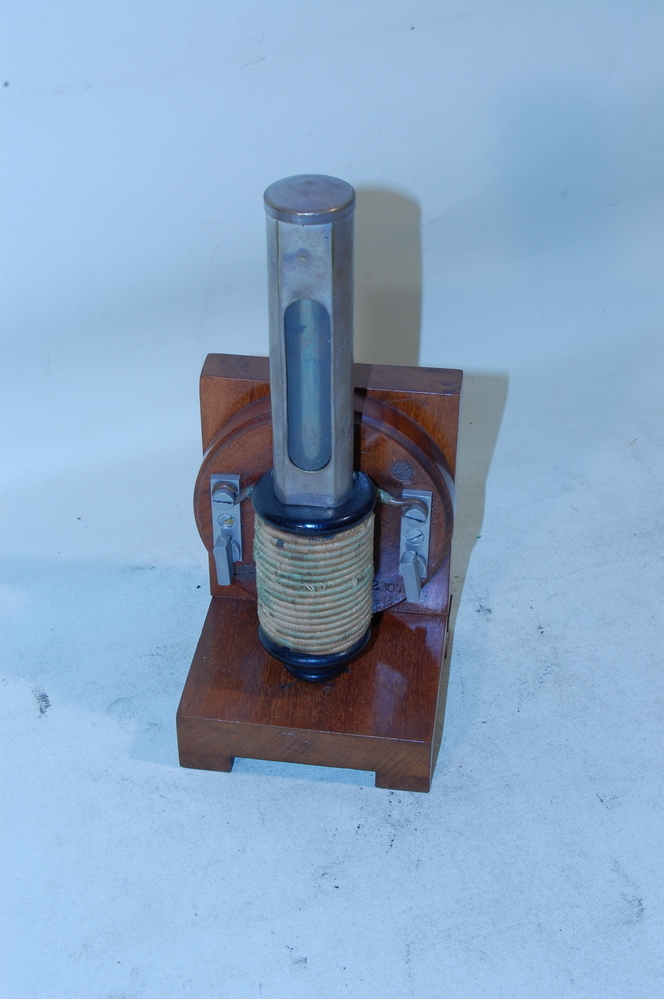 Köhlrausch analoge gelijkstroom weekijzer ampèremeter in verticale metalen buis op houten houder. fabr.serienr: 169262.