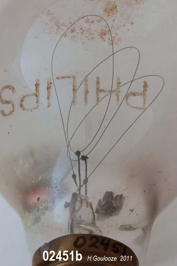 Beschrijving gloeilamp ref. 02451 / uitgave 2 / H.Goulooze Gloeilamp met een heldere glazen ballon, in blokletters gemerkt Philips. Aan de ander zijde van de ballon is de markering aangebracht: Nicolai & Lebret Utrecht. Aan de bovenzijde is de afgesmolten pompbuis zichtbaar, zie 02451a. De huls, E27, is van messing en gemerkt 220-32 en VV ...