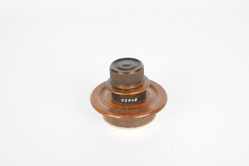 Winter contactdoos met contactstop. Tweepolig met aardcontact tevens vergrendelstift. Vergrendeling van contactstop tegen uittrekken door draaien van de stop. Contactdoos en stop van hout. Contactdoos heeft porseleinen voet. Fabr.serienr: Pat. nr. 79319. Schenking van: Inventum