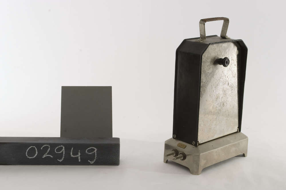 Inventa broodrooster met elektrische verwarming door acht boven elkaar horizontaal gespannen gloeispiralen, 220V 1,7A.. In een afgeschuind rechthoekige zwart metalen behuizing met aan beide zijden verchroomd metalen, horizontaal scharnierende, kleppen met zwarte bakelieten knopjes. Het apparaat heeft een met riet omvlochten handvat en staat op een rechthoekige vernikkeld metalen voetstuk waarin twee contactpennen. Fabr.serienr: 286 ...