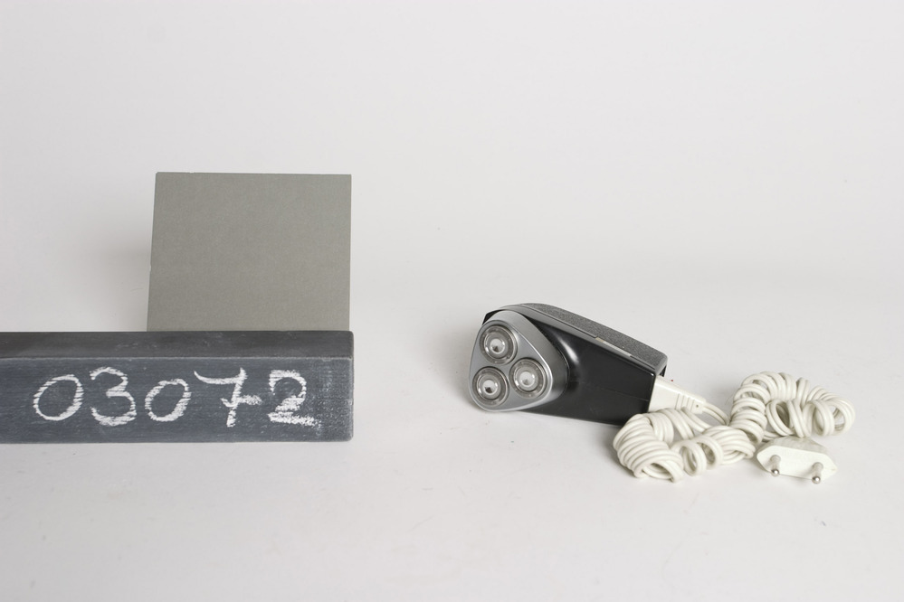 Philips elektrisch scheerapparaat, 110/220V - 12W, met drie verende scheerkoppen in afneembare scheerkop-houder. Het apparaat heeft een zwart kunststof motorhuis en een netspanning-omschakelaar, de aandrijving gebeurt door motor op netspanning. Los spiraal tweeling aansluitsnoer met euro-contactstop.