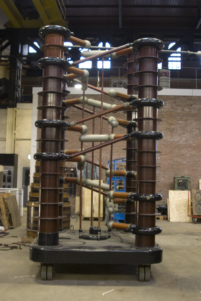 Een Marx generator is een toestel voor het genereren van spanningsstoten van meer dan een miljoen volt, gebouwd in 1937. De installatie heeft afmetingen van 220 * 220 * 500 cm. Er zijn vier donkerbruin gekleurde zuilen met op ieder daarvan vier zwart gekleurde ringen (de condensatoren). Tussen elk tweetal naast elkaar gelegen zuilen bevinden ...