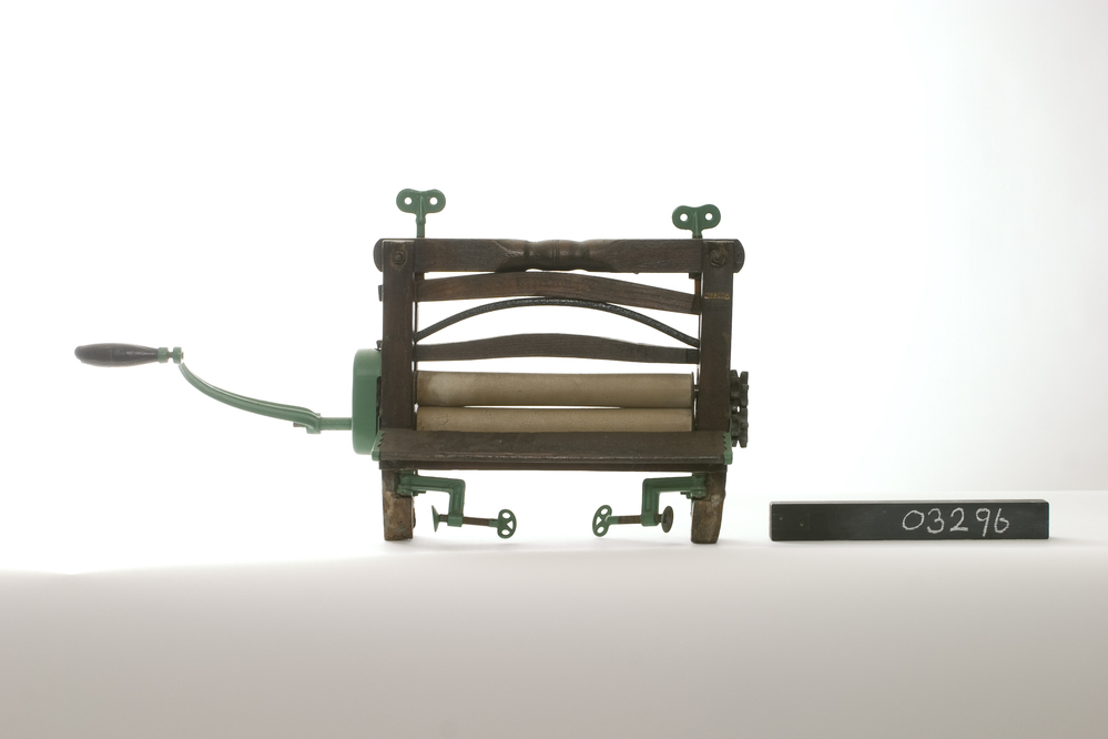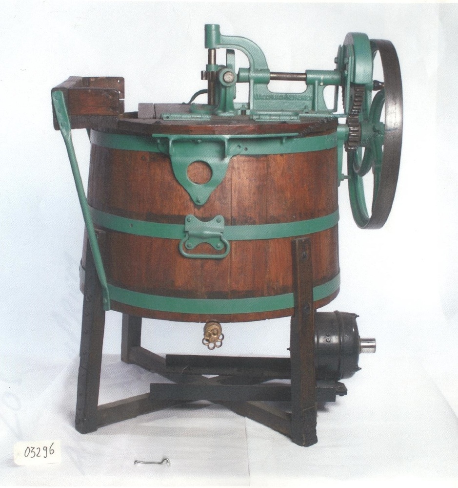 Macvis kuipwasmachine met wringer. De machine bestaat uit een houten kuip met een bruin gelakte wringer, heeft groen gelakt metaalwerk, een aandrijfmotor en zwarte bevestigingssteunen. De aandrijving gebeurt door middel van riem. Open drijfwerk.