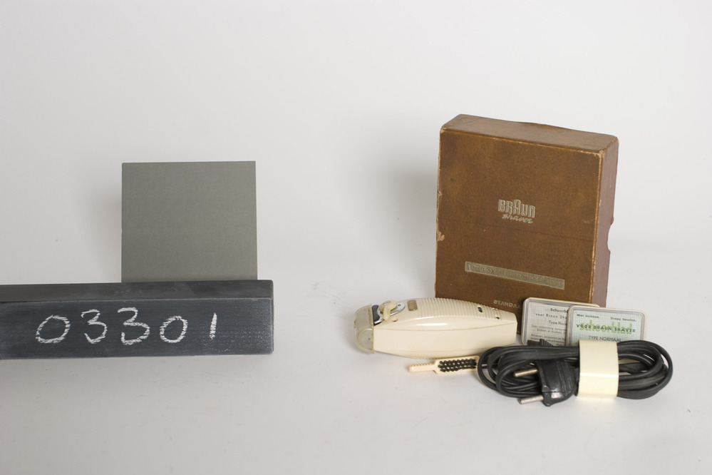 Braun elektrisch scheerapparaat, type S50 Standard, met één vibrerende scheerkop, afneembaar scheerblad en zacht plastic scheerkopdeksel. Het apparaat heeft een crèmekleurig huis met handle voor scheerbladklem, een netspanningomschakelaar, een los zwart tweeling aansluitsnoer en wordt aangedreven door een vibrator op netspanning. Zit in de originele bruine doosverpakking (1 zijkant ontbreekt) en heeft een geel hardplastic ...